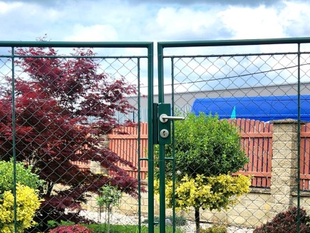 * Křídla bran: - venkovní rámy obou křídel jsou svařeny ze zinkované trubky 38mmm, následně do těchto rámů je vevařen další trubkový rámeček z trubky 14mm a do pravého křídla i kapsa na zamykací mechanismus a do levého zástrč. Následně jsou celé rámy kvalitně poplastován polyesterovým poplastováním na barvu RAL 6005 - jedlová zeleň. Poté je vnitřní rám křídel vypleten a obšit 4-hr. klasickým pletivem EXTRA z pevného drátu 2,7mm.