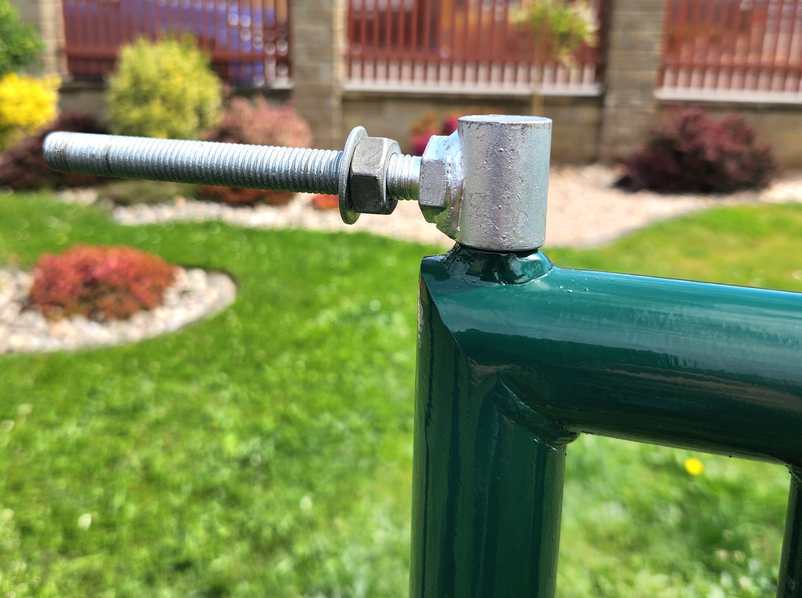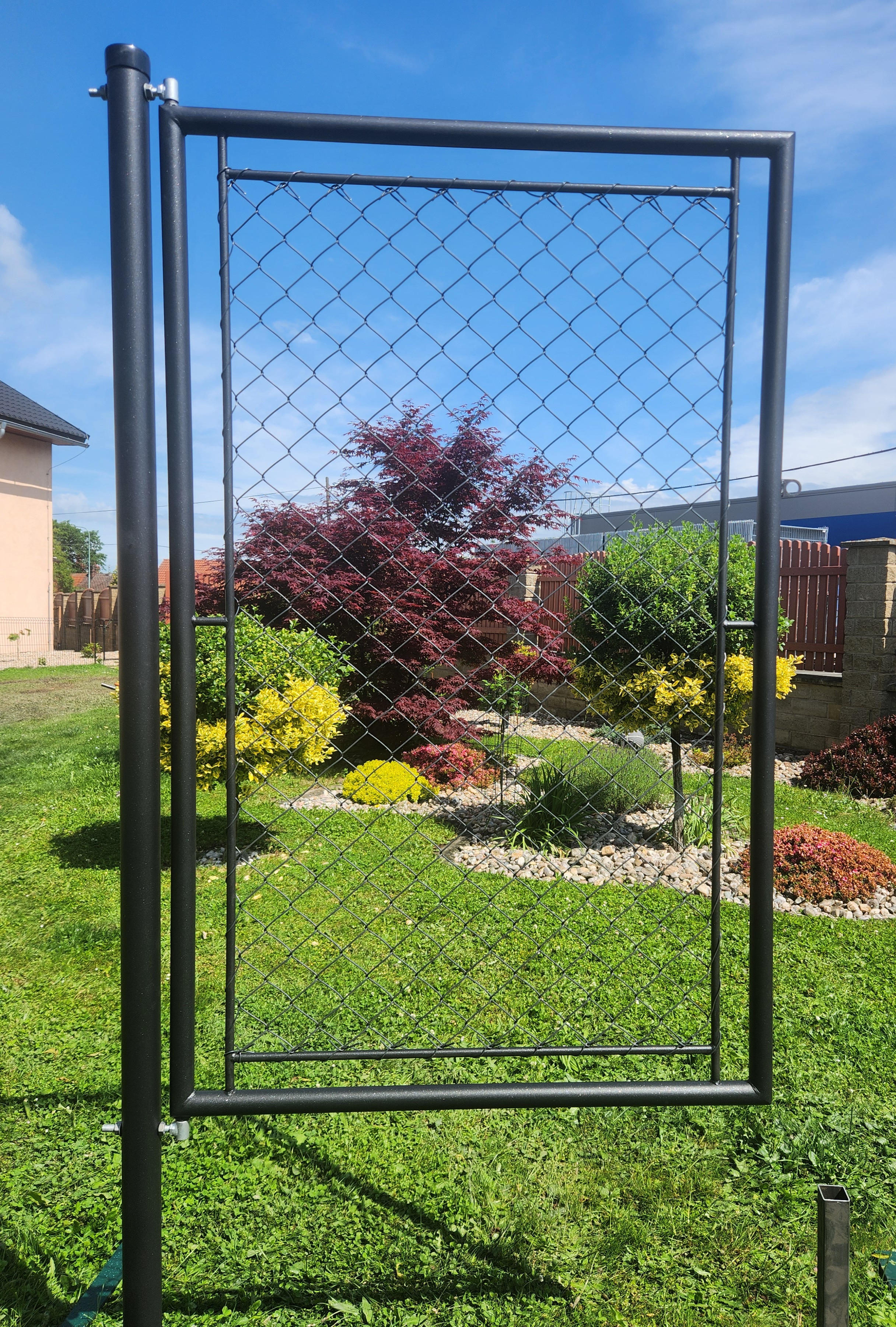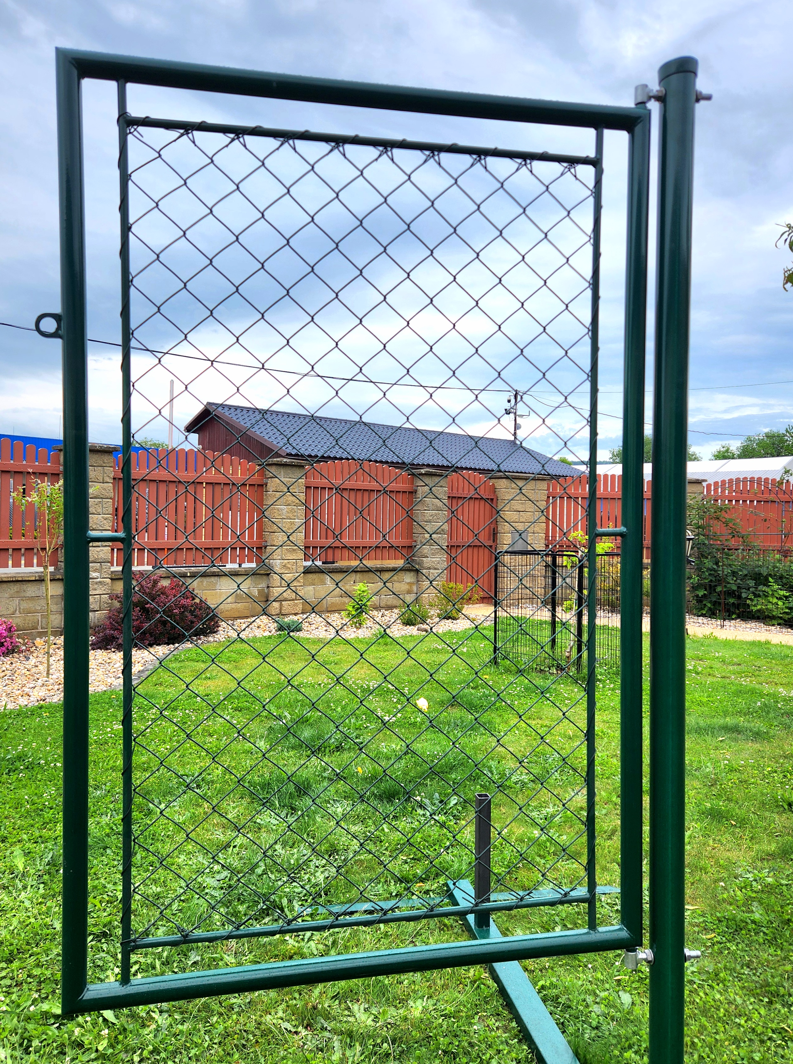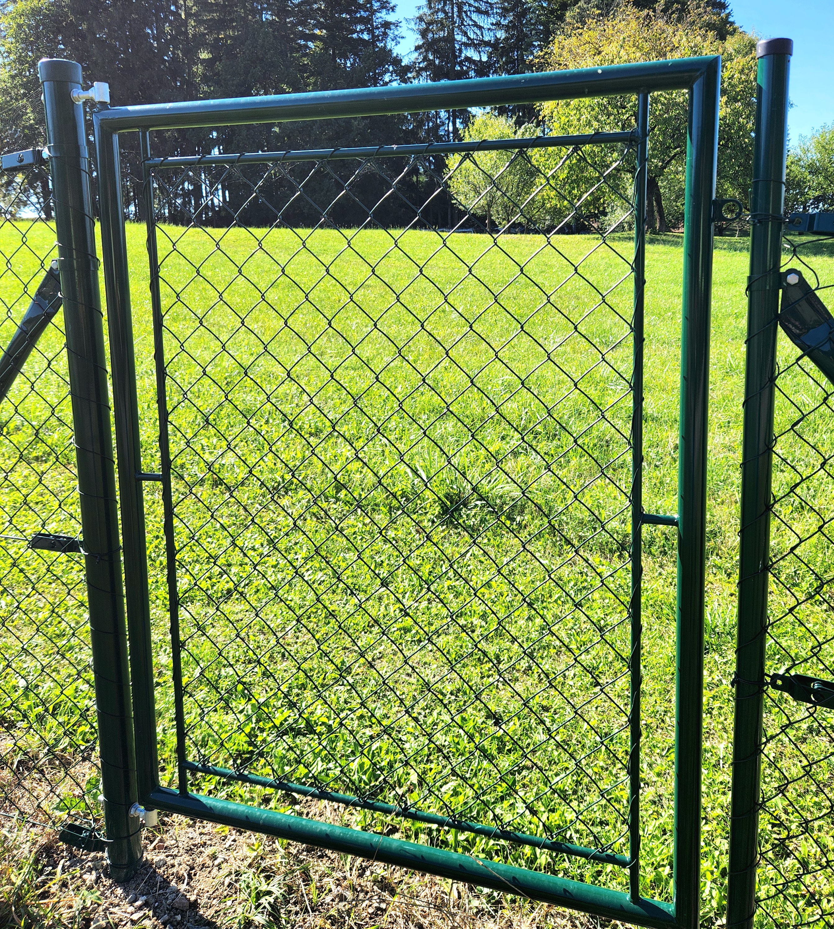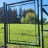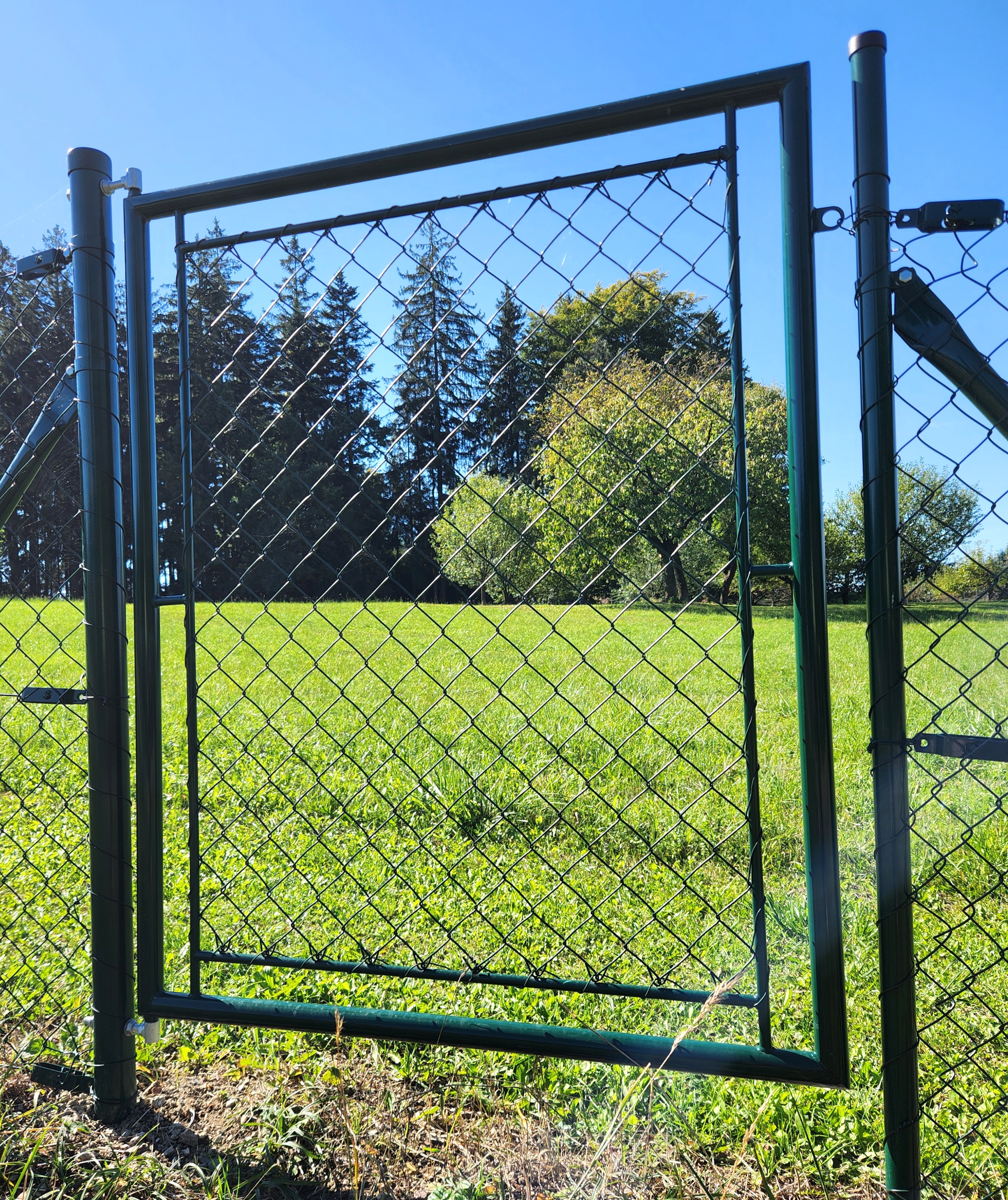 * Křídlo branky - venkovní rám je svařen ze zinkované trubky 38mmm, následně do tohoto rámu je vevařen další trubkový rámeček z trubky 14mm. Následně je celý rám kvalitně poplastován polyuretanovým poplastováním na barvu RAL 6005 - jedlová zeleň. Poté je vnitřní rám vypleten a obšit 4-hr. klasickým pletivem EXTRA z pevného drátu 2,7mm. Na rámu branky je navařené kovové očko pro přichycení visacího zámku.