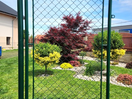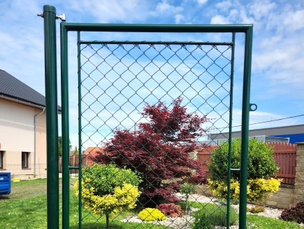 * Křídlo branky - venkovní rám je svařen ze zinkované trubky 38mmm, následně do tohoto rámu je vevařen další trubkový rámeček z trubky 14mm. Následně je celý rám kvalitně poplastován polyuretanovým poplastováním na barvu RAL 6005 - jedlová zeleň. Poté je vnitřní rám vypleten a obšit 4-hr. klasickým pletivem EXTRA z pevného drátu 2,7mm. Na rámu branky je navařené kovové očko pro přichycení visacího zámku.
