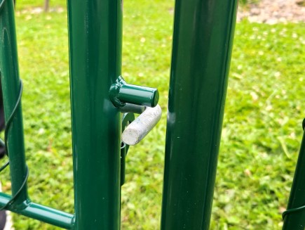 * Torflügel: Die äußeren Rahmen beider Flügel werden aus einem 38-mm-verzinkten Rohr geschweißt. Anschließend wird ein weiterer Rohrrahmen aus 14-mm-Rohr in diese Rahmen eingeschweißt. Im rechten Flügel befindet sich eine Aussparung für den Verriegelungsmechanismus, im linken ein Verschlussstopfen. Der gesamte Rahmen ist mit hochwertigem Polyester-Kunststoff in RAL 6005 (Tannengrün) beschichtet . Der innere Rahmen der Flügel ist mit einem vierseitigen, klassischen EXTRA-Geflecht aus 2,7 mm starkem Draht umflochten und vernäht.