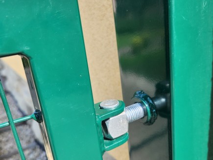 * Torzubehör : oben und unten verstellbares, stärkeres PLUS-Scharnier, mit dem Sie die genaue Position des Torblatts einfach einstellen können, sämtliche Beschläge, Toranschlag, Verschlüsse und Edelstahlgriff . Das Tor kann sowohl zur Straße als auch zum Grundstück hin geöffnet werden (mit Toranschlag aus Blech). Bei der Bestellung müssen wir angeben, ob Sie den Edelstahlgriff von der Straße aus gesehen rechts oder links haben möchten und in den Bestellhinweisen, ob die Türzapfen über den Rahmen hinausragen sollen oder nicht. Für das Tor ist ein Zylindereinsatz erhältlich.