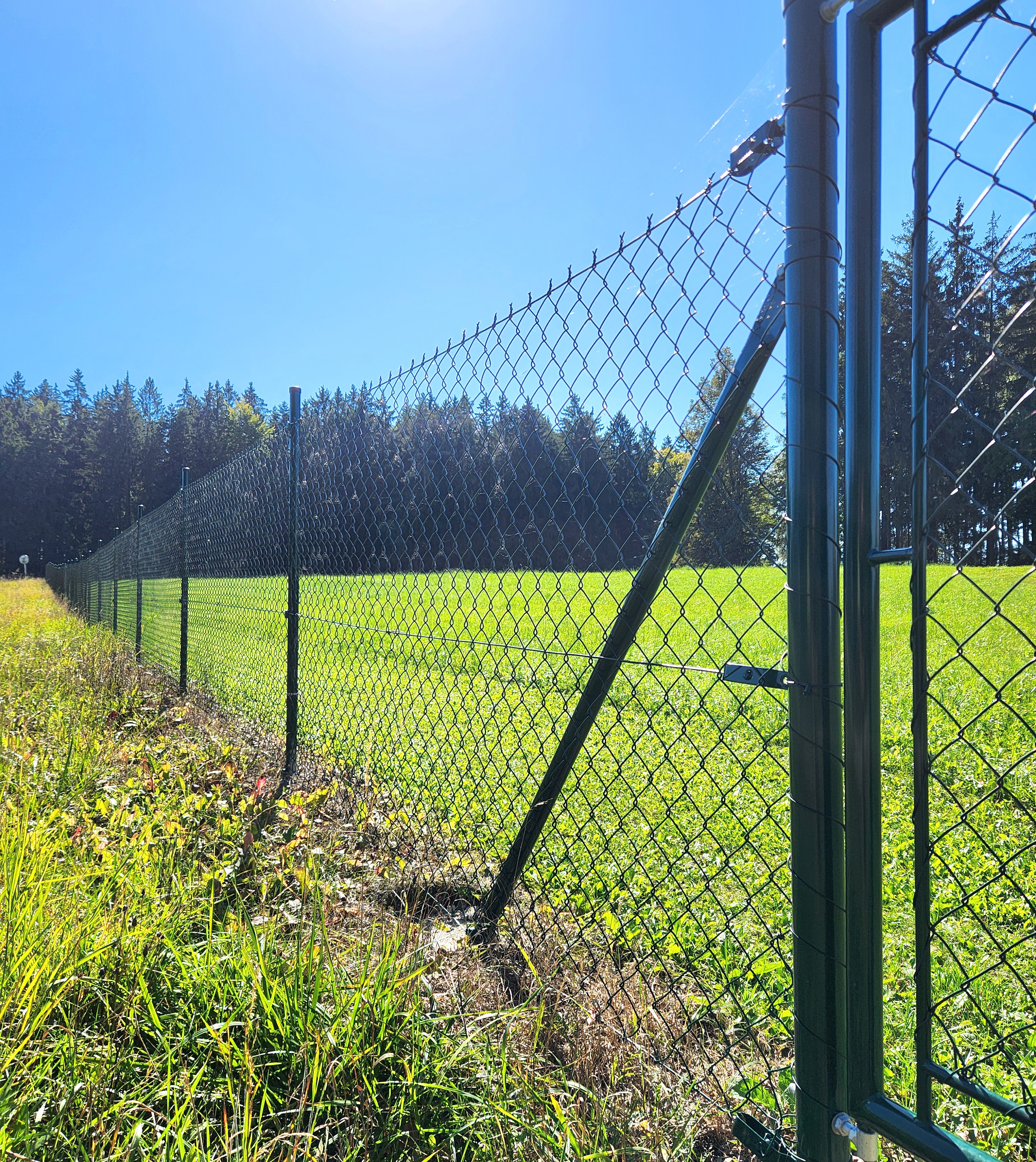 Die im Geflecht verschlungenen Drähte benötigen mindestens einen Kerndurchmesser von 2,5 mm und inkl. 3,5 mm Plastikfolie! Es gibt auch 2,2 mm bis 3,2 mm starke Spanndrähte auf dem Markt, aber wenn schwere Maschen an einem so schwachen 2,2 mm/Draht aufgehängt werden, bricht der gesamte Zaun und wird im Winter zerstört. Draht, der schwächer als 3,5 mm ist, hängt mit der Zeit ebenfalls durch und erzeugt unansehnliche, durchhängende Maschenwellen auf dem Zaun. Für bergiges Gelände empfehlen wir sogar Spanndraht mit einem Durchmesser von 4,0 mm in Kombination mit Forte-Netz .