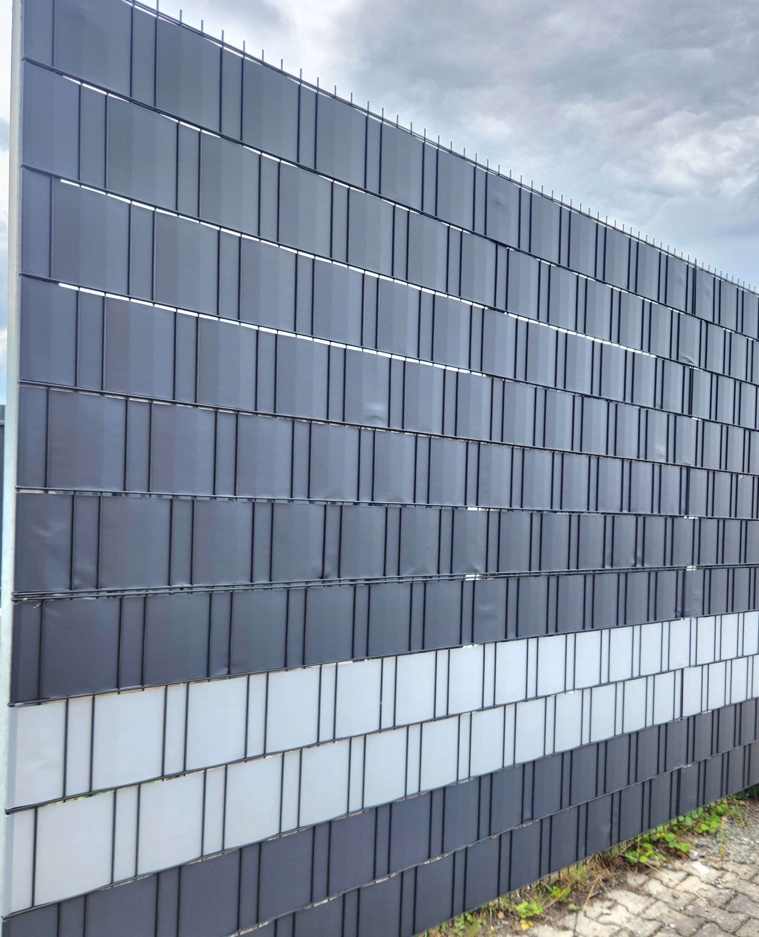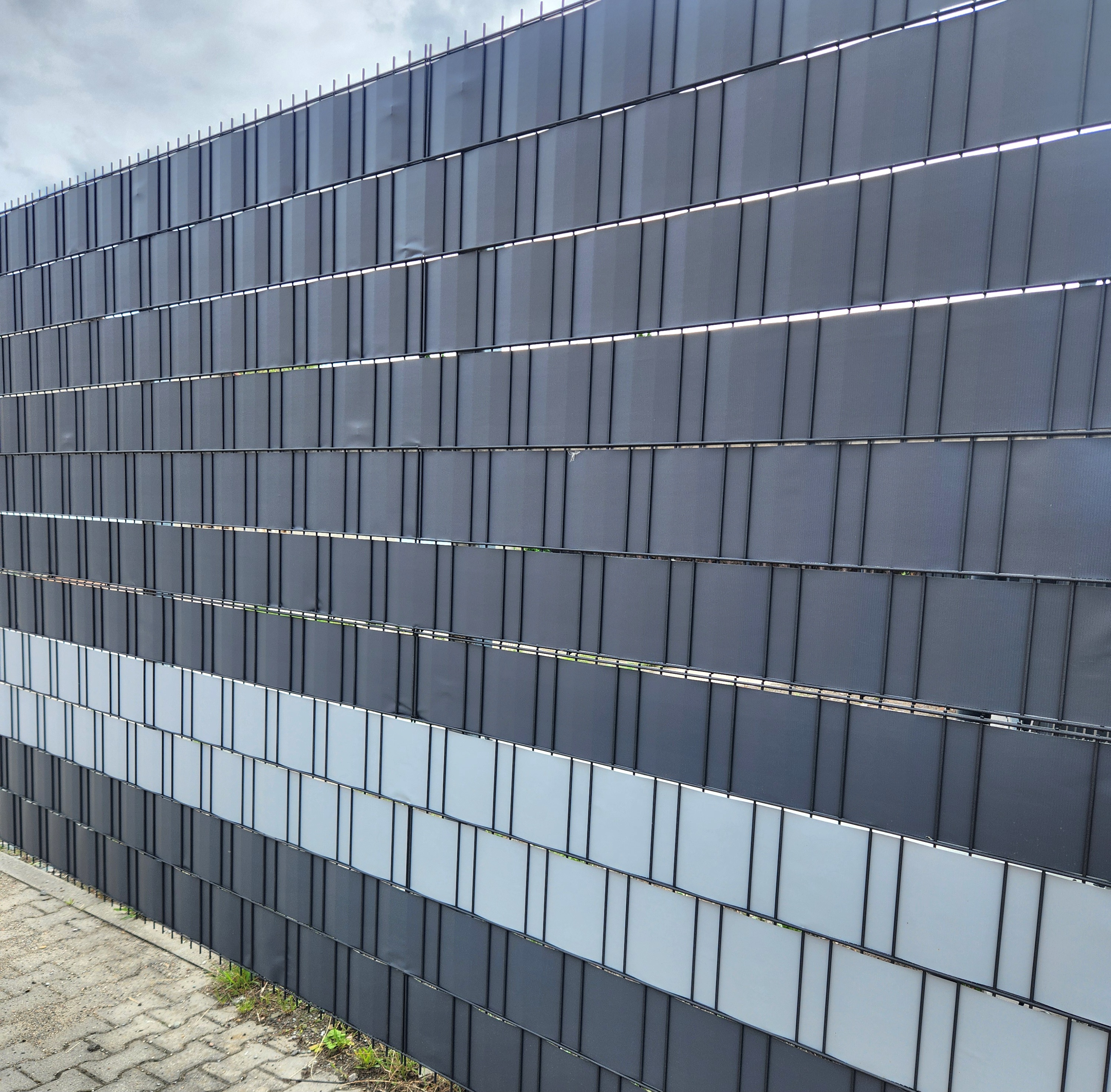 Das Band besteht aus hochwertigem HDPE-Material inklusive REACH-Zertifikat, was Langzeitstabilität und Haltbarkeit garantiert. Die Installation erfolgt, indem das Band horizontal durch die Öse des Paneels geführt wird, am Anfang und am Ende des Paneels wird das Band um den Draht gewickelt und am Clip befestigt. Wir bieten diese Bänder in 3 Farbtönen an – Grün RAL 6005, Anthrazit RAL 7016 und Grau RAL 7038. Es ist möglich und sehr effektiv, die Farben der Bänder im Zaun zu kombinieren.