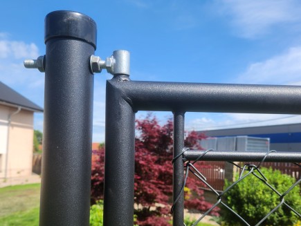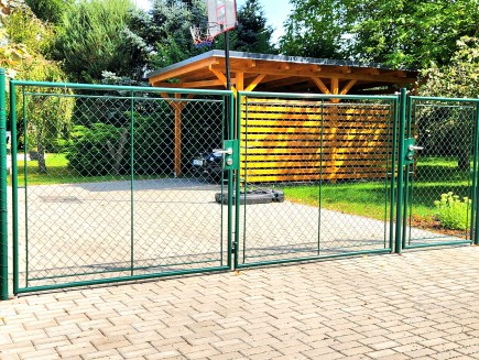 * Torflügel: Die äußeren Rahmen beider Flügel werden aus einem 38-mm-verzinkten Rohr geschweißt. Anschließend wird ein weiterer Rohrrahmen aus 14-mm-Rohr in diese Rahmen eingeschweißt. Im rechten Flügel befindet sich eine Aussparung für den Verriegelungsmechanismus, im linken ein Verschlussstopfen. Der gesamte Rahmen ist mit hochwertigem Polyester-Kunststoff in RAL 6005 (Tannengrün) beschichtet . Der innere Rahmen der Flügel ist mit einem vierseitigen, klassischen EXTRA-Geflecht aus 2,7 mm starkem Draht umflochten und vernäht.