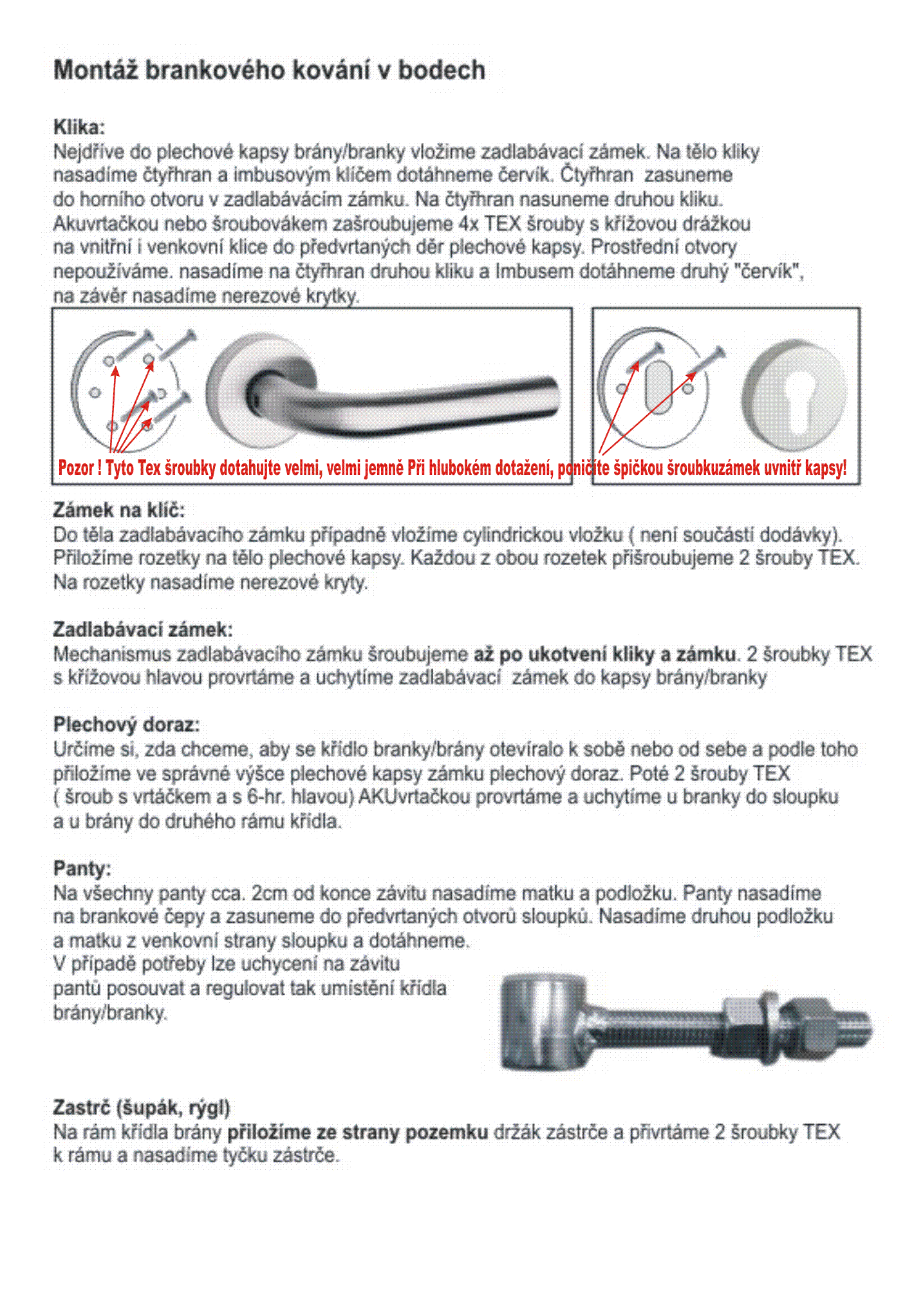 * Zubehör für das Tor: Ein Satz verstellbarer oberer und unterer Scharniere für jeden Pfosten, mit denen sich die Position der Torflügel präzise einstellen lässt, sowie alle Beschläge, ein verstellbarer Anschlag für den rechten Flügel nach links, alle Befestigungselemente und ein Griff mit Schließmechanismus – alles in wartungsfreier Ausführung . Dem Tor liegt eine Montageanleitung für eine einfache Montage bei.