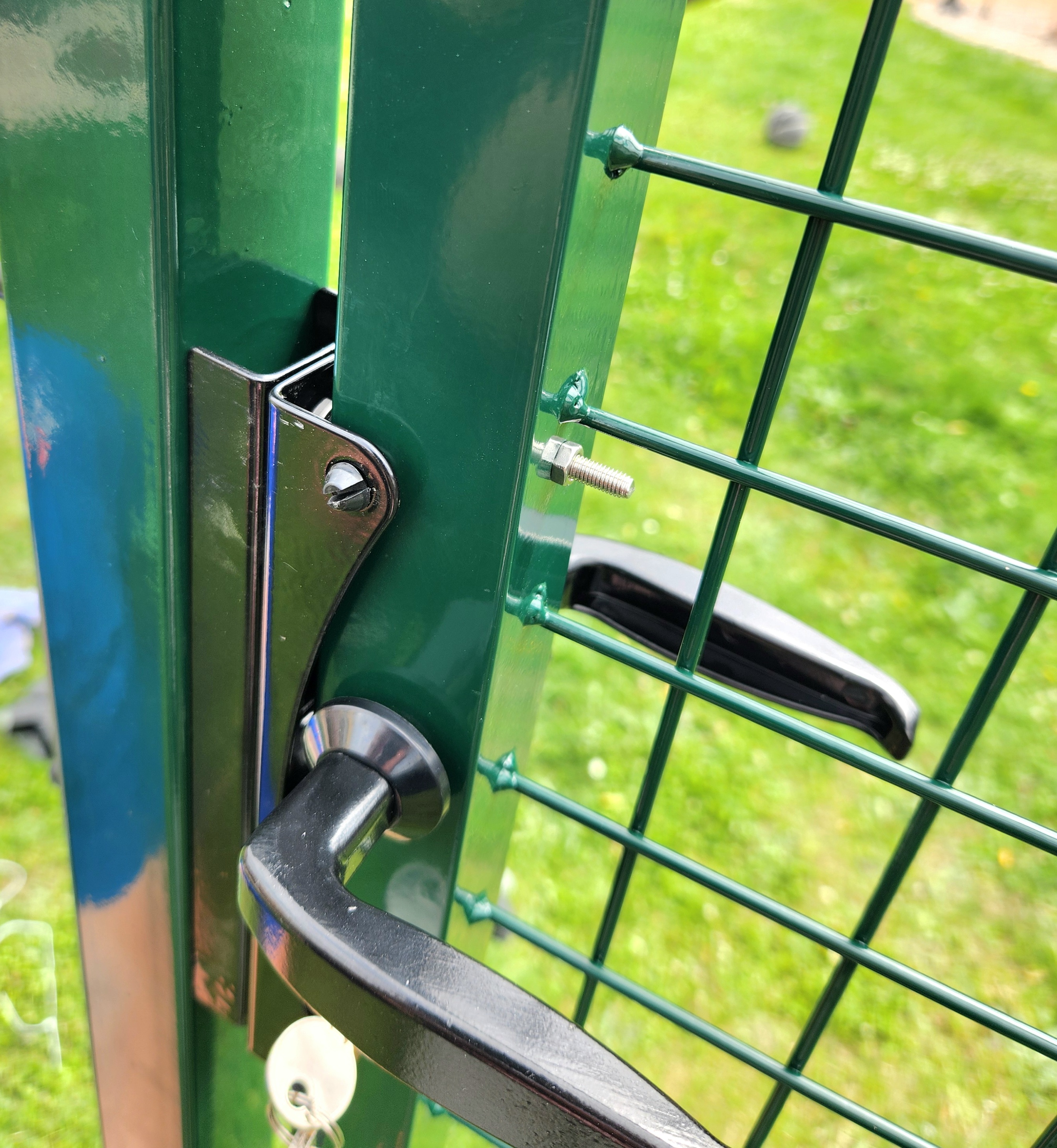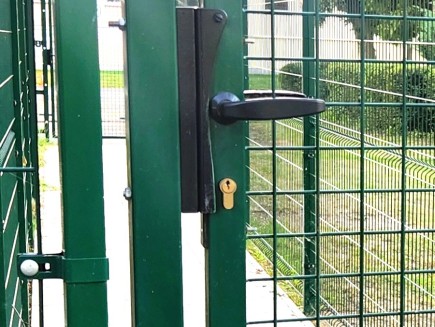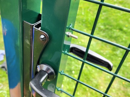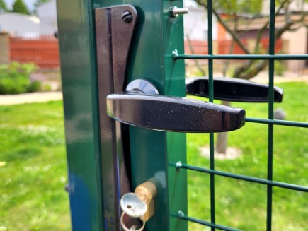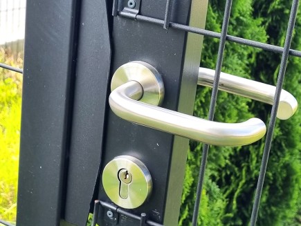 * Torzubehör: obere und untere verstellbare Scharniere , mit denen Sie die genaue Position des Torblatts einfach einstellen können, ein Toranschlag , der bestimmt, ob sich das Tor zum Grundstück oder zur Straße öffnet, sämtliche Beschläge , ein Griff und ein zylindrisches, konisches Schloss, das in den Torblattrahmen eingesetzt ist. Das Tor ist universell für Rechts- und Linkshänder geeignet . Mit dem Anschlag können Sie die Öffnungsrichtung zu Ihnen hin oder von Ihnen weg einstellen.