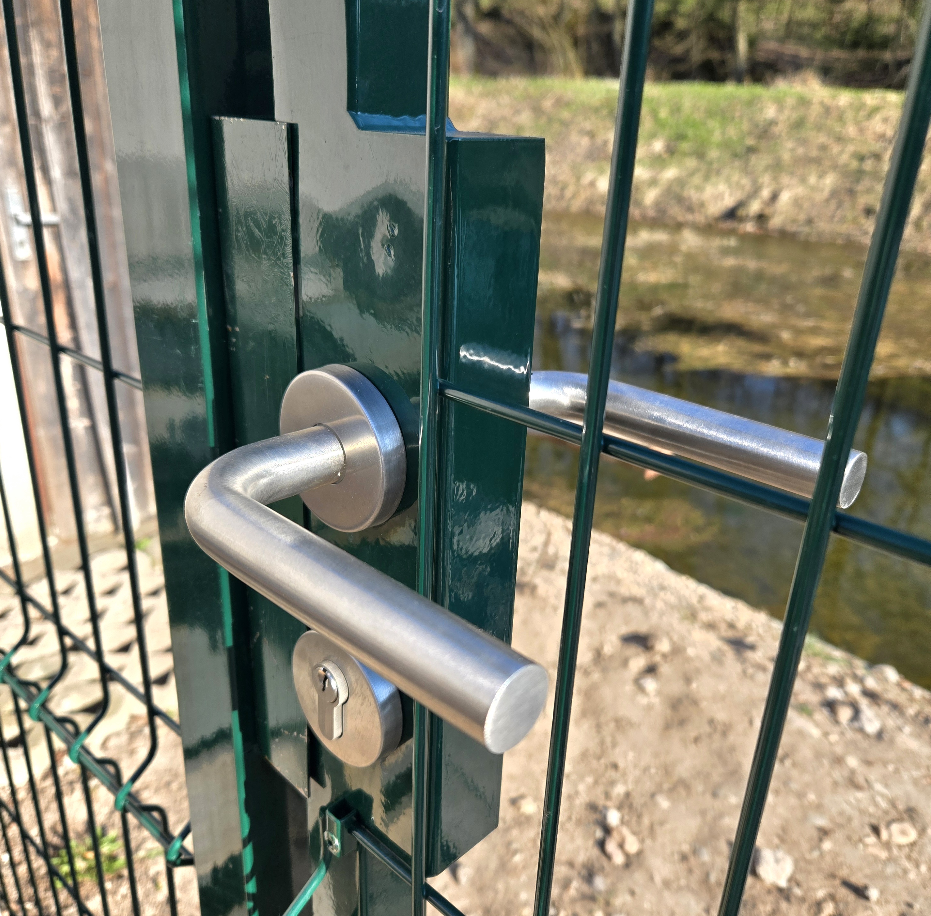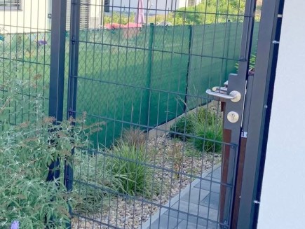 * Torzubehör : oben und unten verstellbares, stärkeres PLUS-Scharnier, mit dem Sie die genaue Position des Torblatts einfach einstellen können, sämtliche Beschläge, Toranschlag, Verschlüsse und Edelstahlgriff . Das Tor kann sowohl zur Straße als auch zum Grundstück hin geöffnet werden (mit Toranschlag aus Blech). Bei der Bestellung müssen wir angeben, ob Sie den Edelstahlgriff von der Straße aus gesehen rechts oder links haben möchten und in den Bestellhinweisen, ob die Türzapfen über den Rahmen hinausragen sollen oder nicht. Für das Tor ist ein Zylindereinsatz erhältlich.