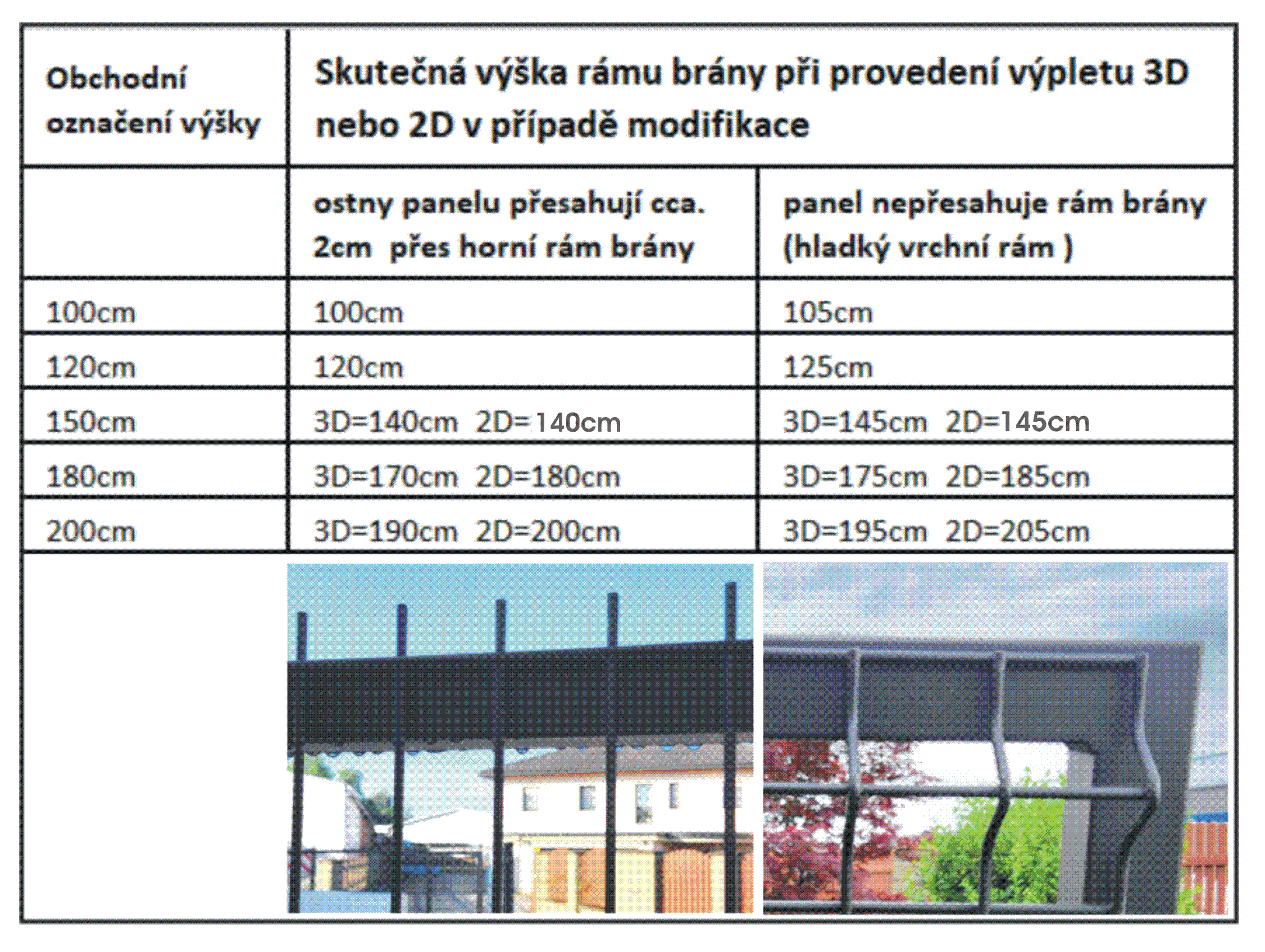 * Torfüllung 3D- und 2D-Paneel - verwenden Sie die Änderungsschaltfläche, um den Typ des 3D- oder 2D-Drahtes auszuwählen. Dies ist eine sehr beliebte Version des Designs, da das Tor kompakt aussieht und dem umgebenden Zaun entspricht, der mit dem Tor verbunden ist. Auf den Rahmen von der Vorderansichtsseite (von der Straße aus) nieten wir das gewünschte 3D- oder 2D-Paneel in Grün oder Anthrazit mit starken Edelstahlverschlüssen in der Farbe des Tores. Der Vorteil ist, dass der auf diese Weise vorne platzierte Draht im Falle einer Beschädigung leicht repariert und ausgetauscht werden kann. Um das Paneel richtig zu befestigen, passen wir die Höhe des Rahmens standardmäßig gemäß dieser Tabelle an. Vergessen Sie nicht, dass das Tor 3 - 9 cm über dem Gelände installiert wird.