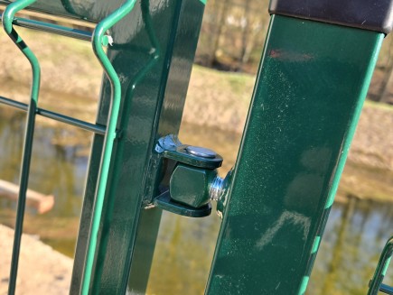 * Torzubehör: obere und untere verstellbare Scharniere , mit denen Sie die genaue Position des Torblatts einfach einstellen können, ein Toranschlag , der bestimmt, ob sich das Tor zum Grundstück oder zur Straße öffnet, sämtliche Beschläge , ein Griff und ein zylindrisches, konisches Schloss, das in den Torblattrahmen eingesetzt ist. Das Tor ist universell für Rechts- und Linkshänder geeignet . Mit dem Anschlag können Sie die Öffnungsrichtung zu Ihnen hin oder von Ihnen weg einstellen.