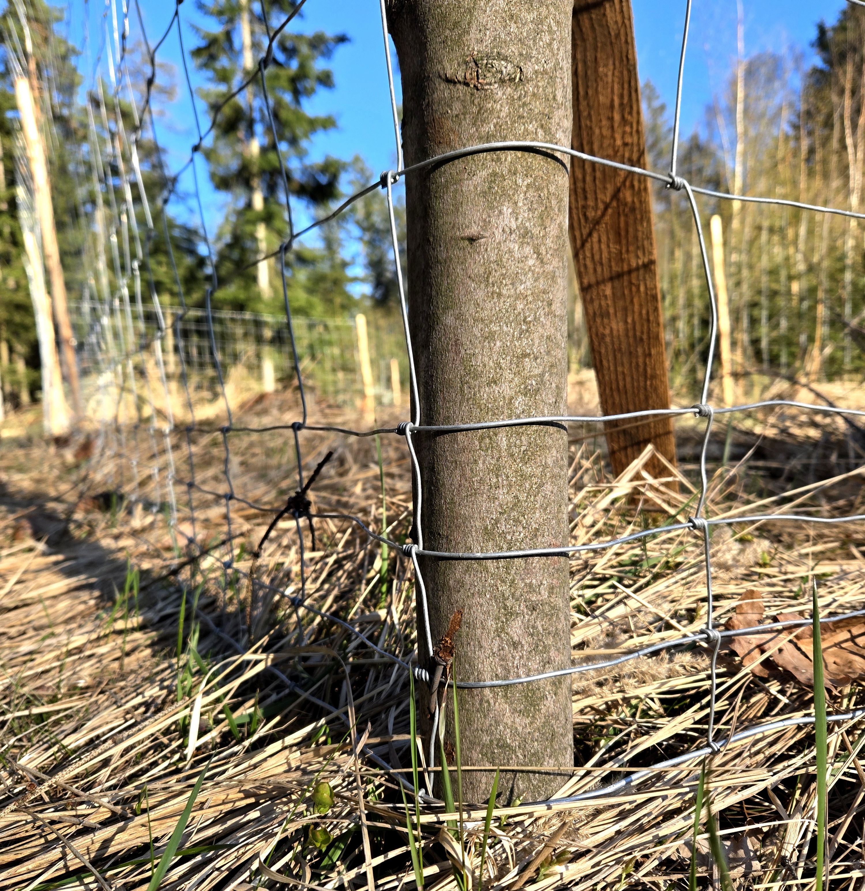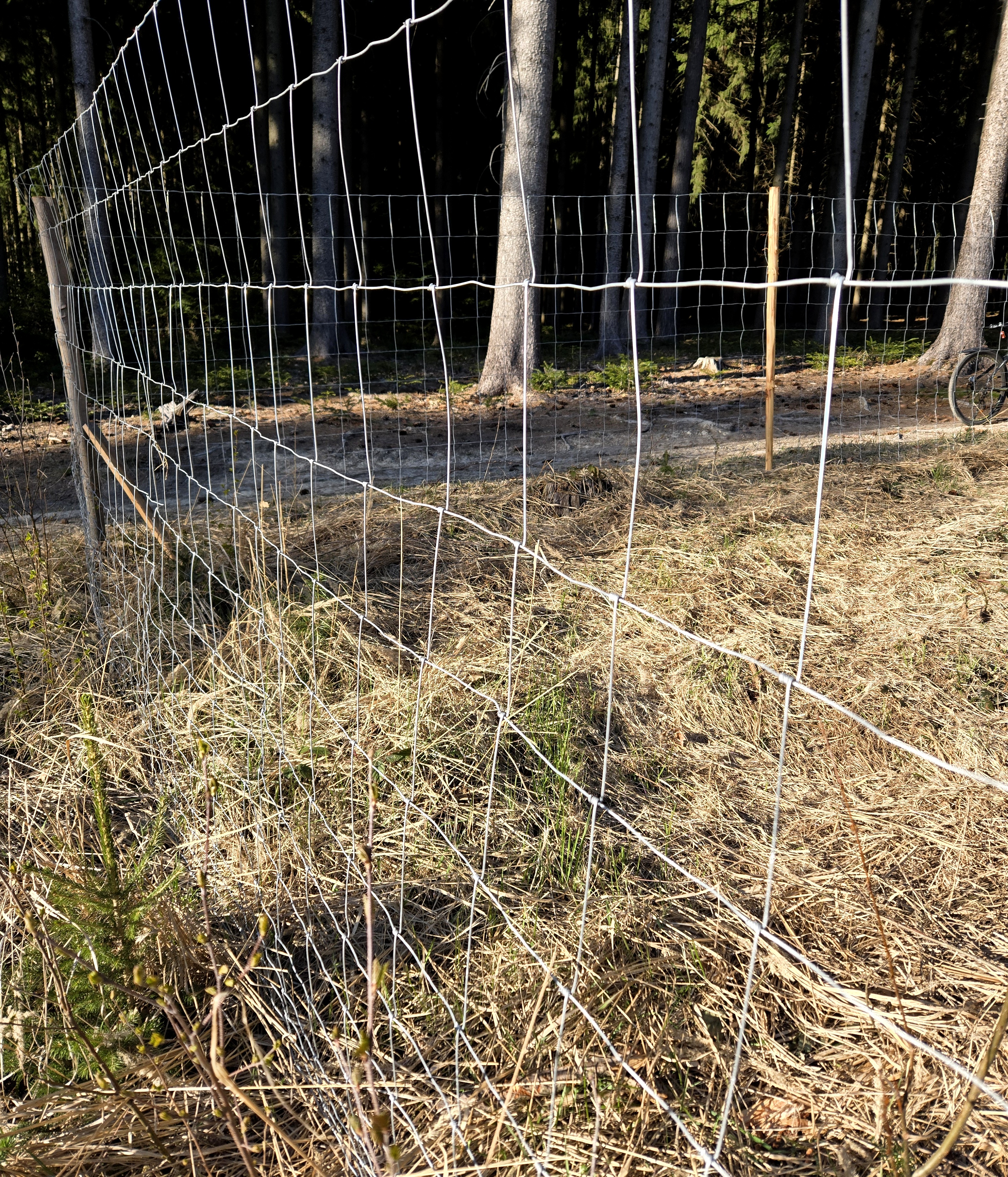 Maschenhöhe 160 cm, horizontale und vertikale Drähte mit einem Durchmesser von 1,8 mm, oberer und unterer horizontaler Draht 2,5 mm, 14 Reihen horizontaler Drähte (ab 5 cm Abstand), vertikaler Drahtabstand beträgt 15 cm.