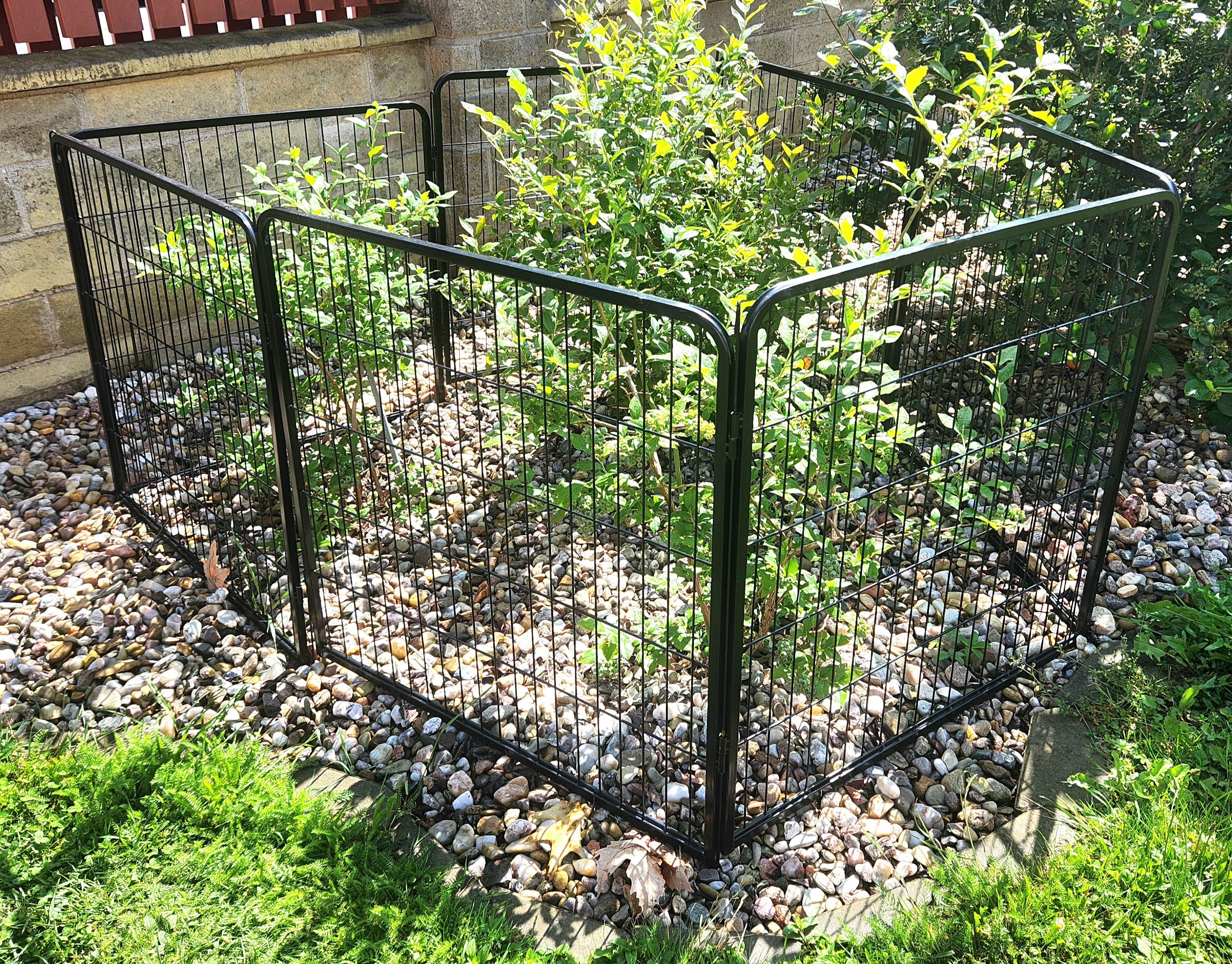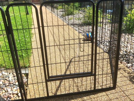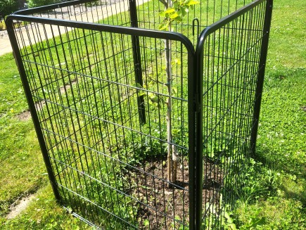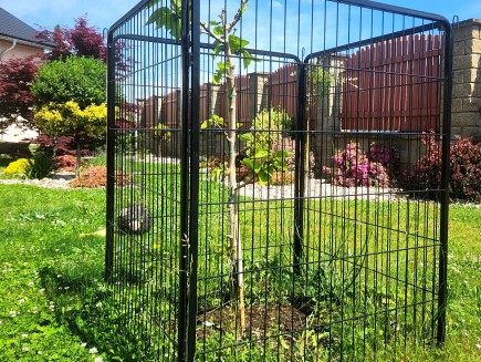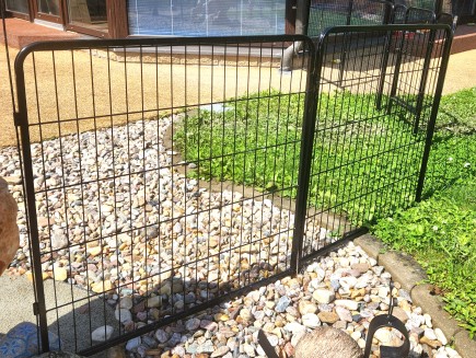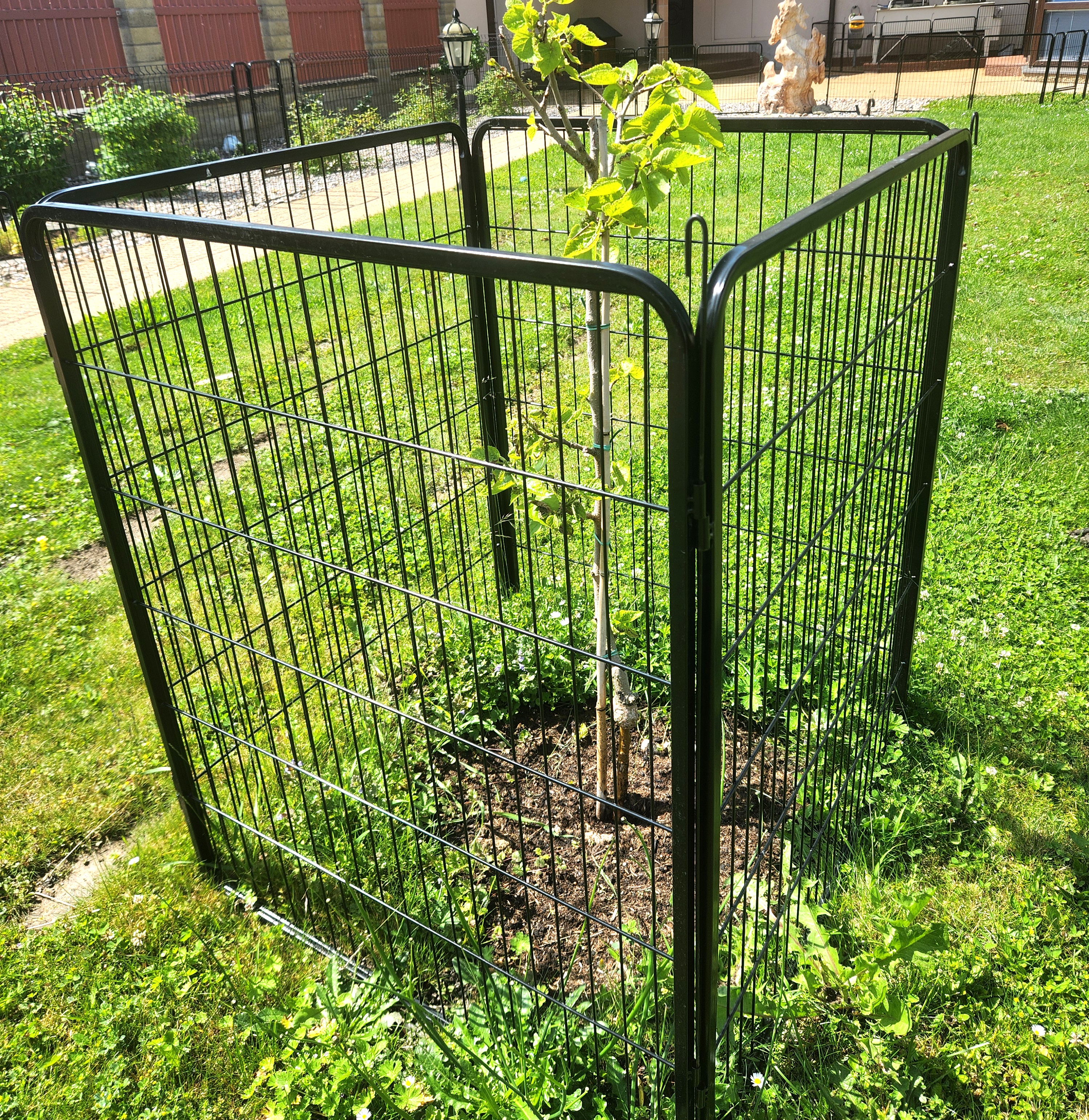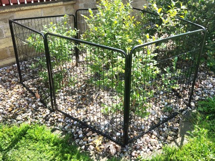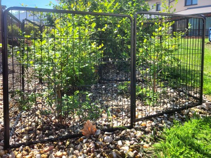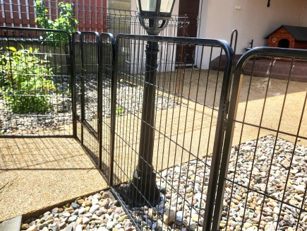 7 kunststoffbeschichtete Paneele, 100 cm hoch x 80 cm lang . Die Maschenweite der Paneele beträgt 15 x 3,5 cm, der Drahtdurchmesser 3,3 mm. Der Rahmen hat ein Profil von 15 x 15 mm.