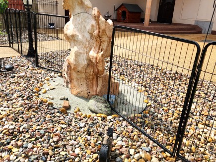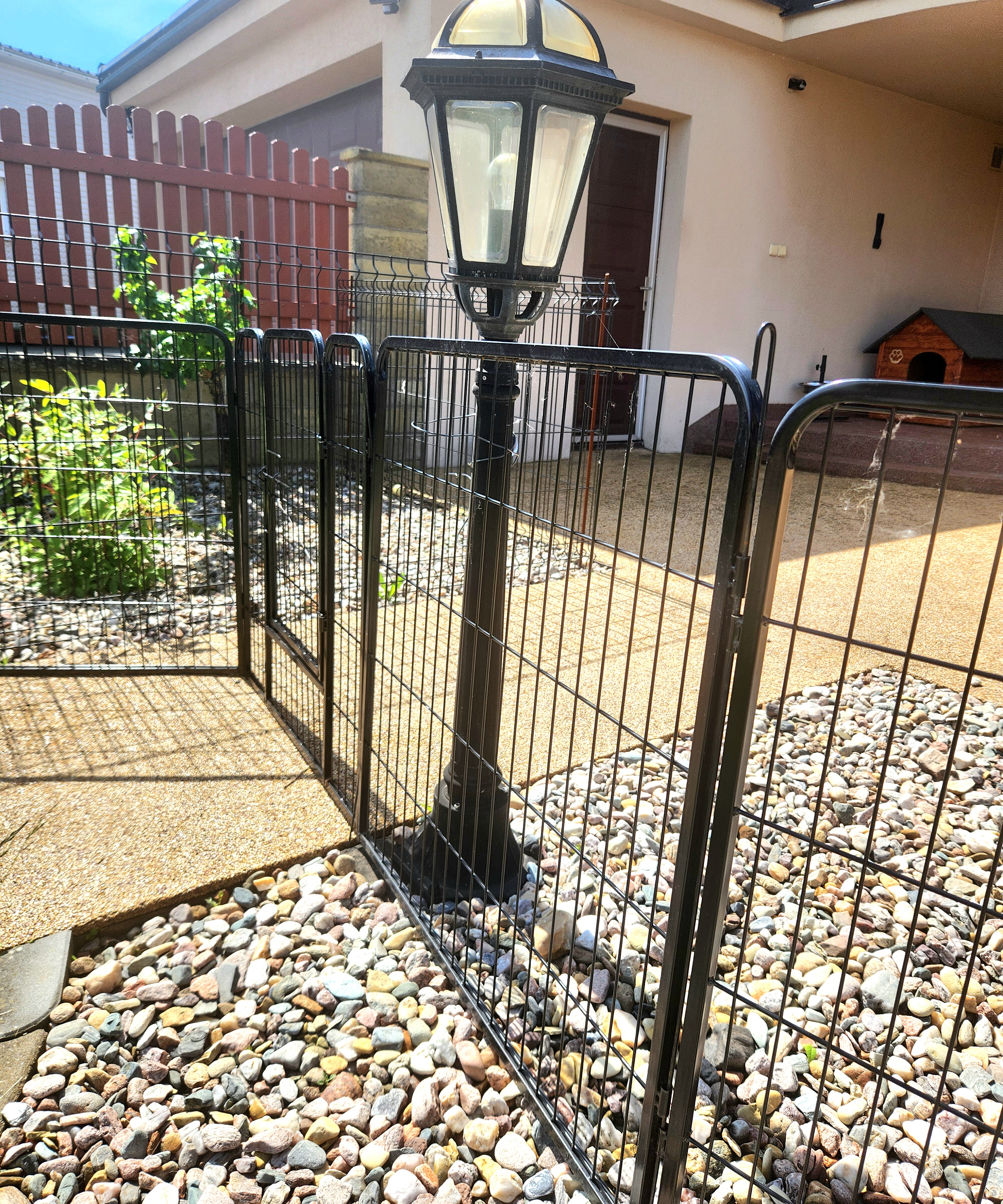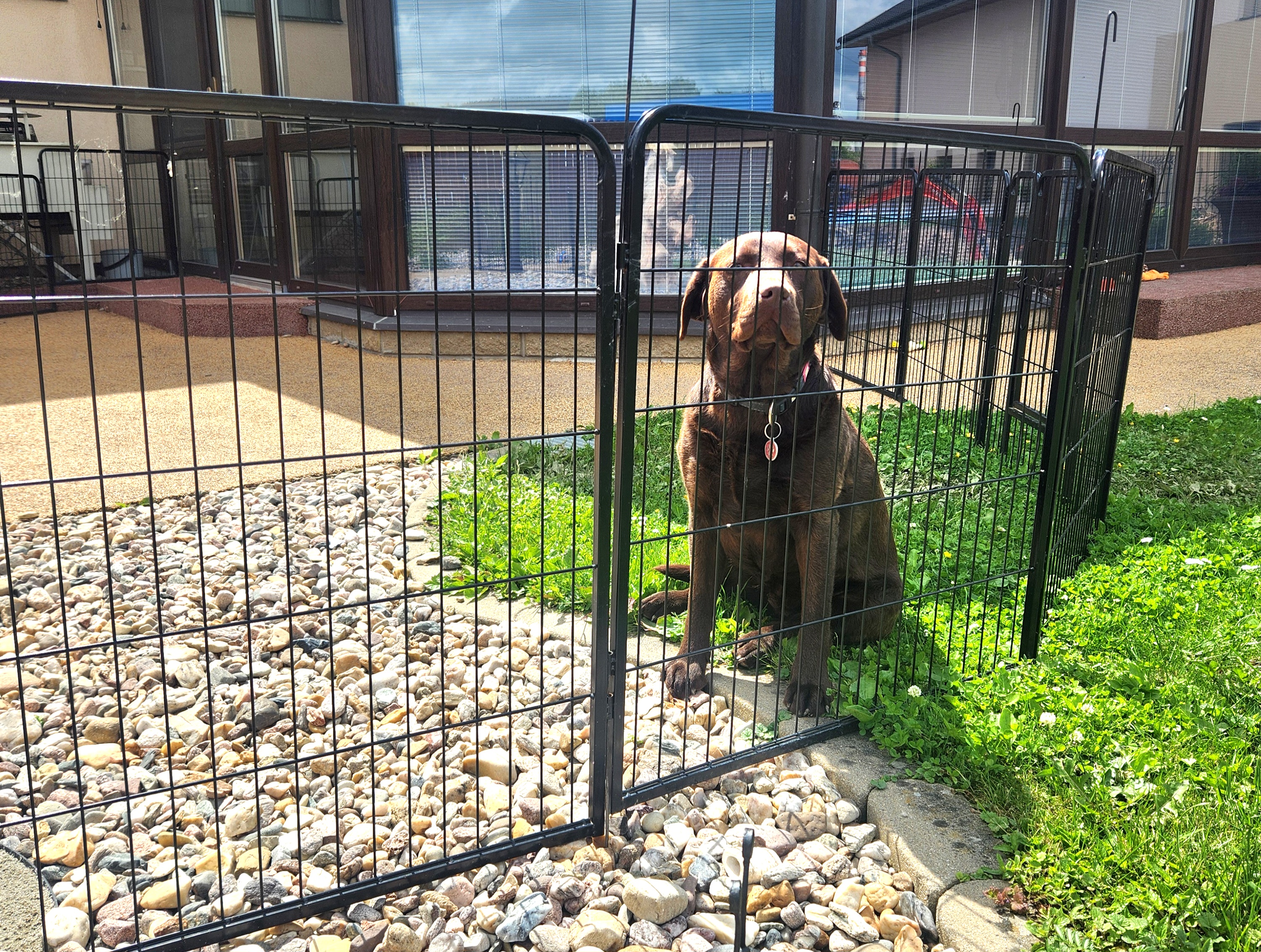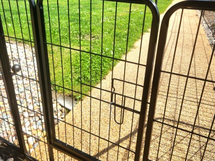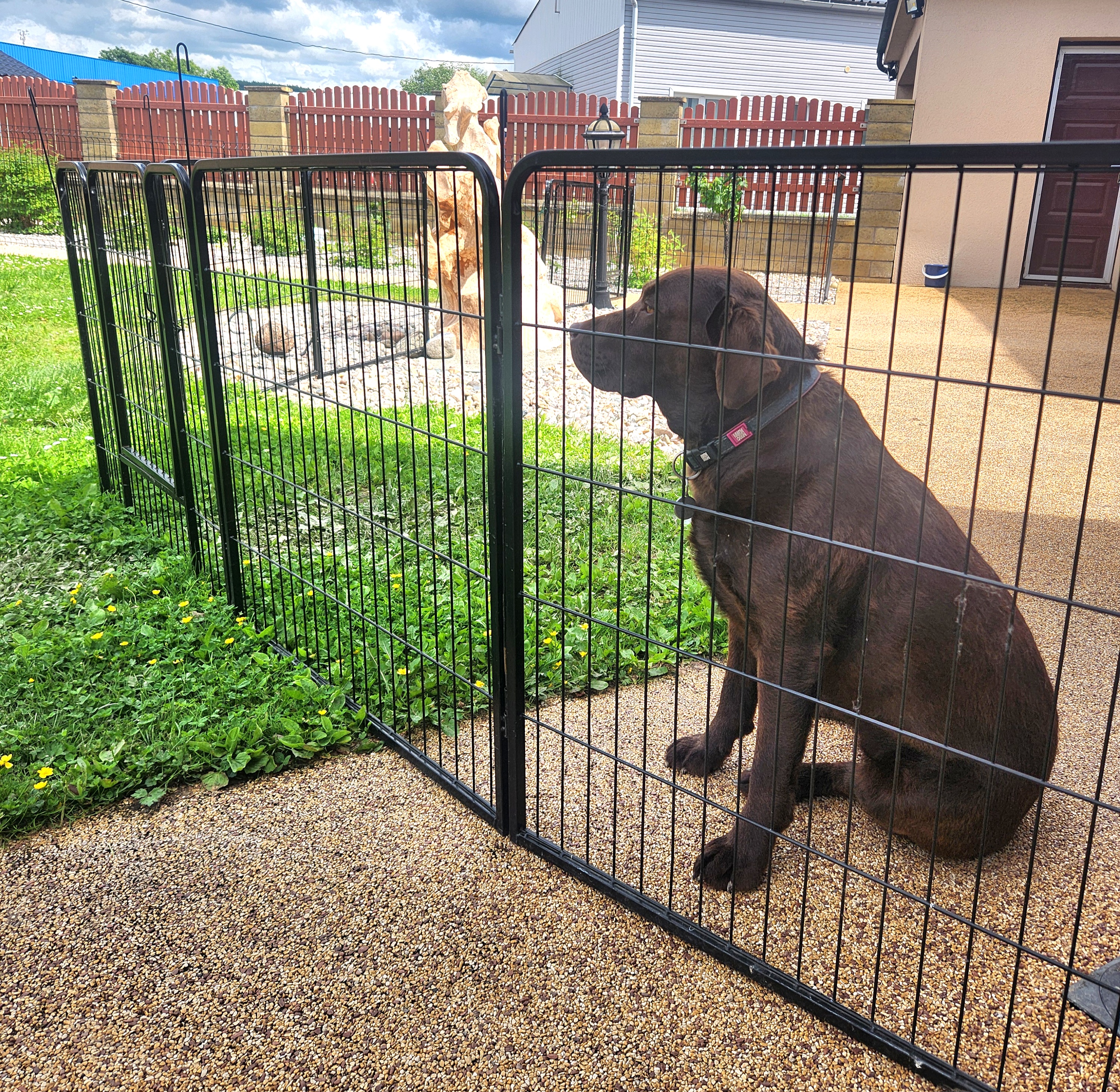 7 kunststoffbeschichtete Paneele, 100 cm hoch x 80 cm lang . Die Maschenweite der Paneele beträgt 15 x 3,5 cm, der Drahtdurchmesser 3,3 mm. Der Rahmen hat ein Profil von 15 x 15 mm.