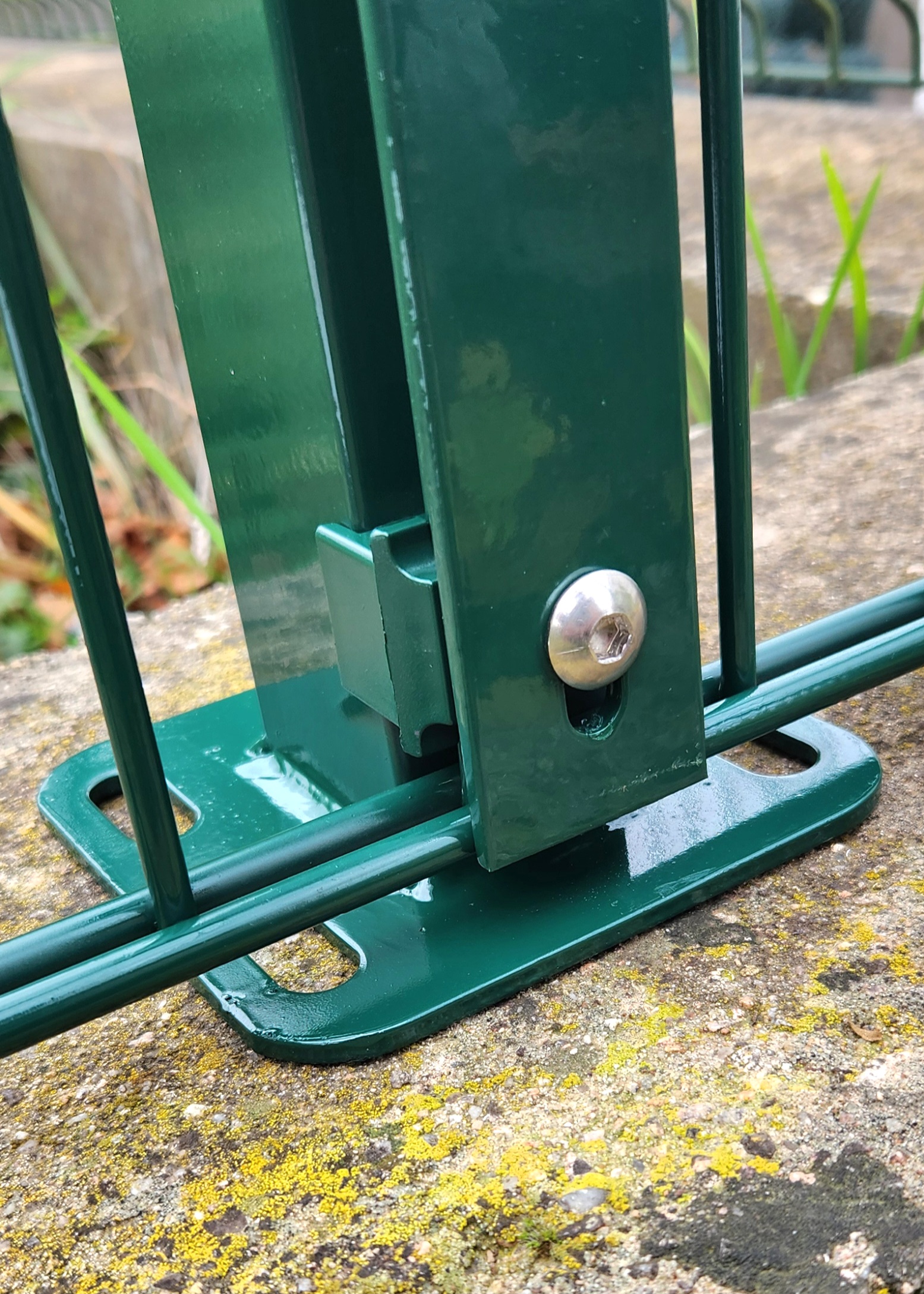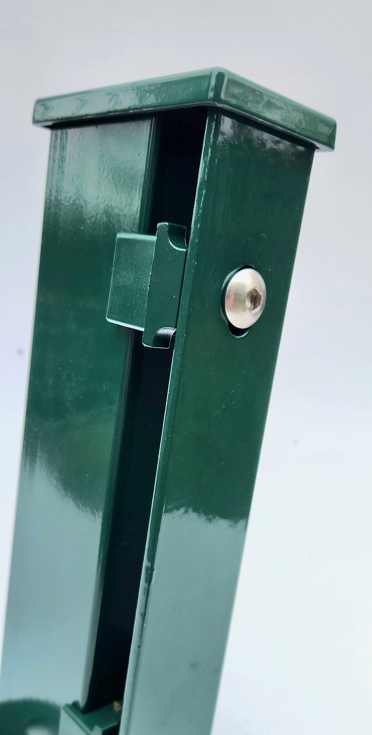 The modern post with a base for concrete surfaces (or in the version for concrete) height 150 cm is made of galvanized jackl profile 60x40/1.8mm with extremely high-quality zinc treatment according to the standard DX51D + Z275 and then plasticized with a polyester coating in the color RAL 6005 (green ) the same surface as our Lario panels, gates, etc.. ) The post wall is 1.8 mm. The plastic-coated polyurethane surface ensures high resistance and a long service life. Color green RAL 6005. Plastic coated in the Czech Republic under ISO 9002 certification. The post includes a black top cap, spacers and cover bar and connecting screws. You can use the column either to attach the panels to the column from the front side or for the system of endless assembly of panels, when the panel just passes through the column.
