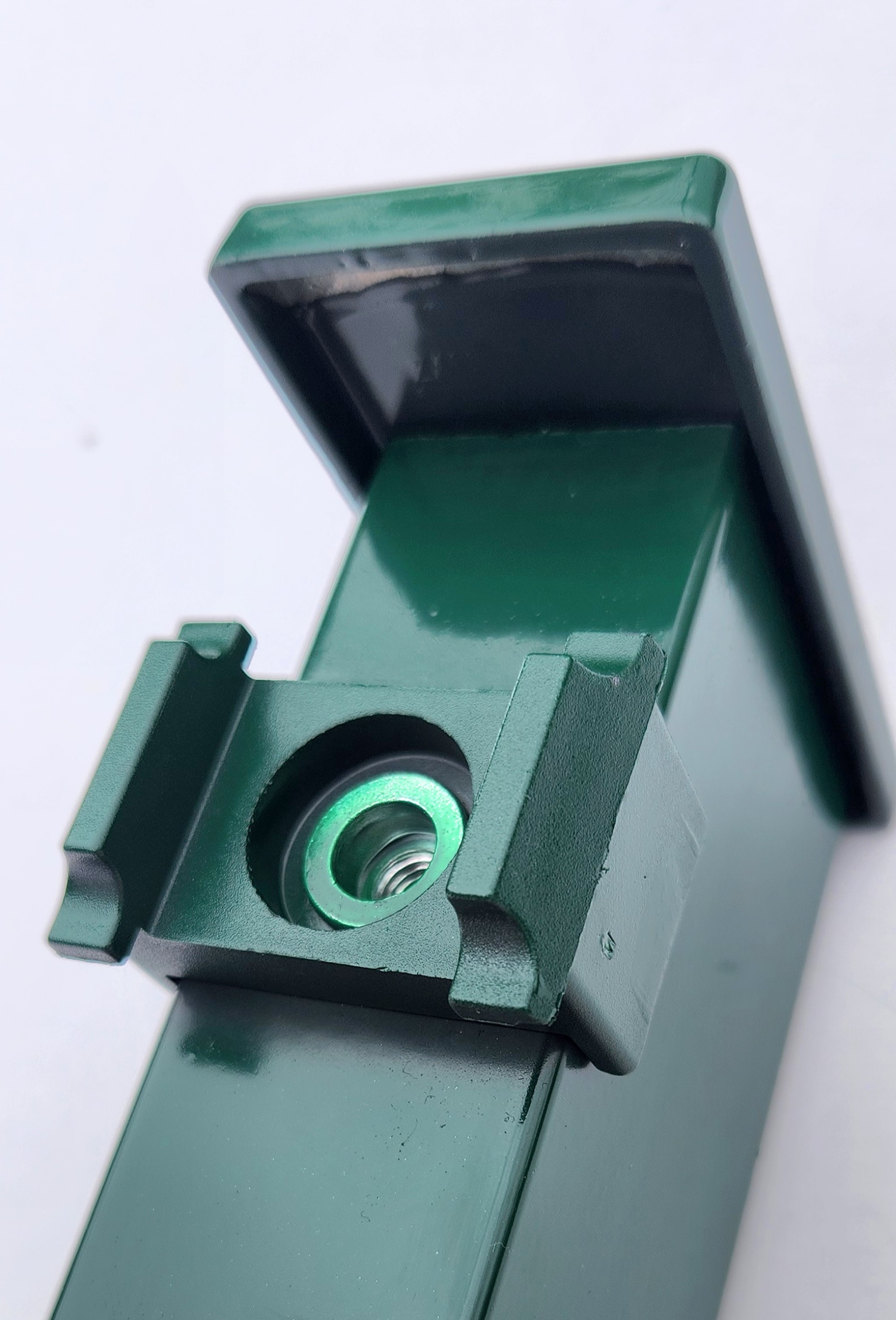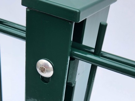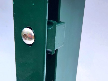 From the front side of the post, M8 internal threaded eyes are pressed into the body of the post and plastic spacers are attached for attaching a 2D or 3D panel (both types of panels can be installed universally). The entire front side of the post is elegantly covered with a 5mm wall strip that overlaps the panel joint.