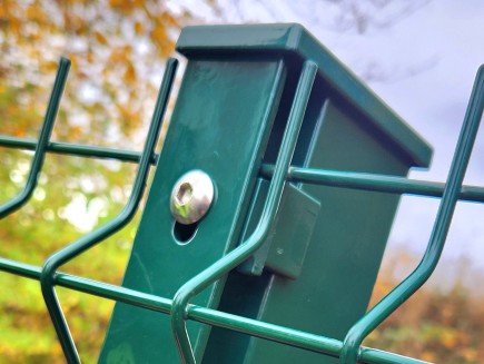 From the front side of the post, M8 internal threaded eyes are pressed into the body of the post and plastic spacers are attached for attaching a 2D or 3D panel (both types of panels can be installed universally). The entire front side of the post is elegantly covered with a 5mm wall strip that overlaps the panel joint.
