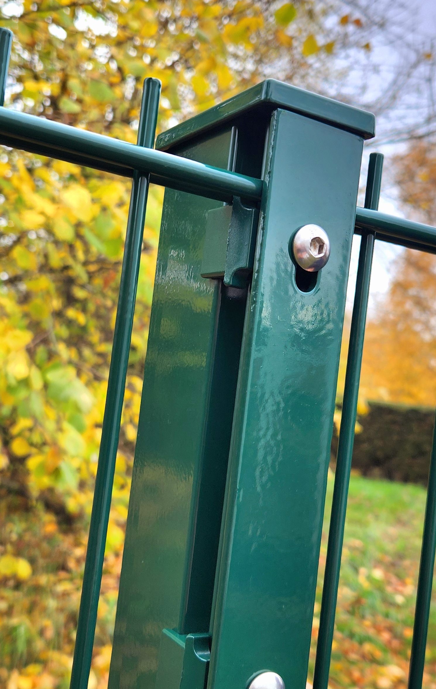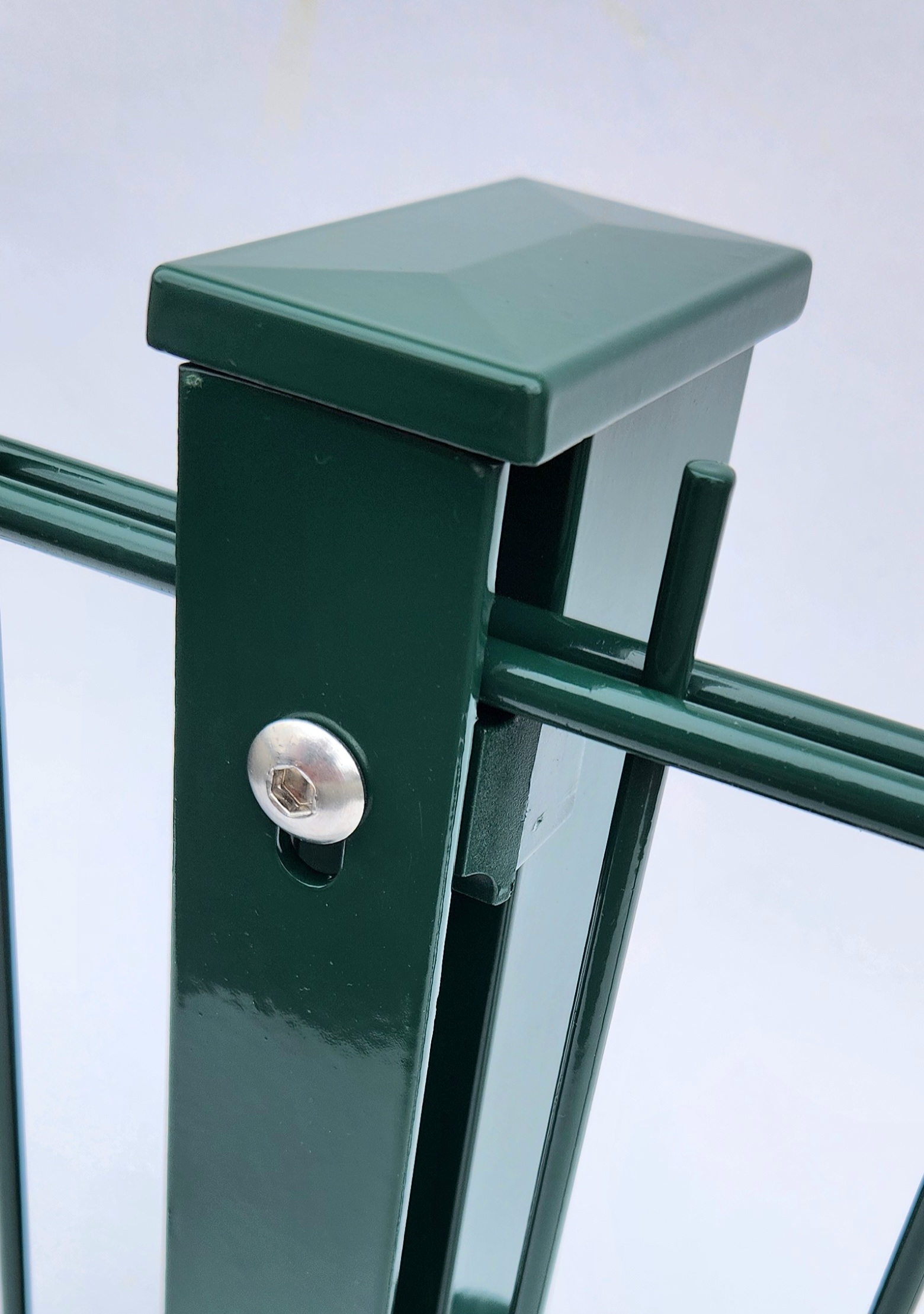 The modern post with a base for concrete surfaces (or in the version for concrete) height 200 cm is made of galvanized jackl profile 60x40/1.8mm with extremely high-quality zinc treatment according to standard DX51D + Z275 and then plasticized with a polyester coating in the color RAL 6005 (green ) the same surface as our Lario panels, gates, etc.. ) The post wall is 1.8 mm. The plastic-coated polyurethane surface ensures high resistance and a long service life. Color green RAL 6005. Plastic coated in the Czech Republic under ISO 9002 certification. The post includes a black top cap, spacers and cover bar and connecting screws. You can use the column either to attach the panels to the column from the front side or for the system of endless assembly of panels, when the panel just passes through the column.