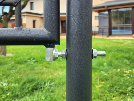 The left gate leaf, when viewed from the street , is secured against unintentional opening by a plug ("slide", locking pin), which ensures arbitrary movement of the leaf, for example, in the wind. Welded eyes are used to lock the leaves together, into which the padlock shackle is threaded and the gate is locked "from the street side". The opening angle of the gate leaves is approx. 130°. Our tip! If you intend to lock the gate from the inside, purchase 2 eyelets for the gate , which you screw onto the frame of the leaves from the inside and you can lock the gate from the property.