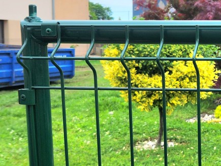 * Gate leaves: - the outer frames of both leaves are welded from a 38mm galvanized pipe , then another tubular frame from a 14mm pipe is welded into these frames. On both leaves, there are welded eyes from the visible side "from the street" and a plug on the left leaf from the inside. Subsequently, the entire frames are high-quality polyurethane plasticized in the color RAL 6005 - fir green . Then the inner frame of the leaves is woven and sewn with a 4-sided classic EXTRA mesh made of solid wire 2.7mm.