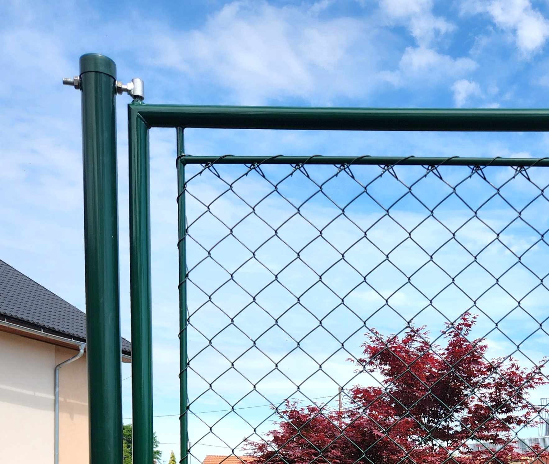 * Gate leaves: - the outer frames of both leaves are welded from a 38mm galvanized pipe , then another tubular frame from a 14mm pipe is welded into these frames. On both leaves, there are welded eyes from the visible side "from the street" and a plug on the left leaf from the inside. Subsequently, the entire frames are high-quality polyurethane plasticized in the color RAL 6005 - fir green . Then the inner frame of the leaves is woven and sewn with a 4-sided classic EXTRA mesh made of solid wire 2.7mm.
