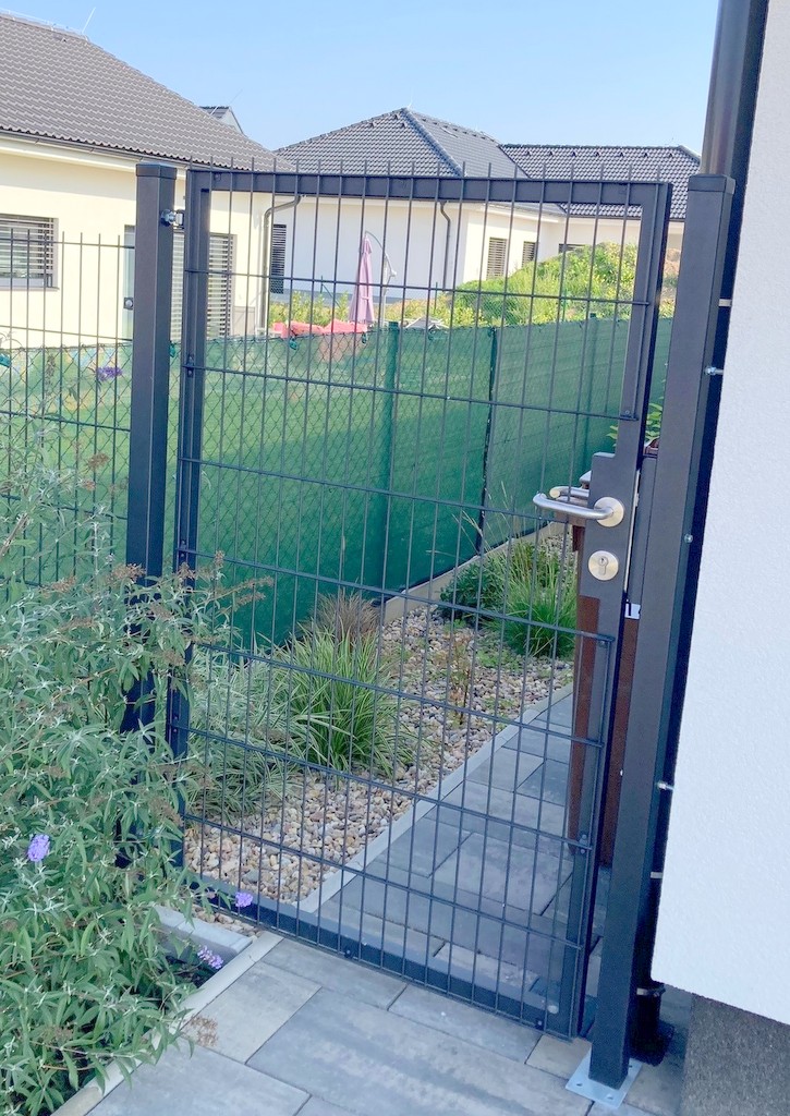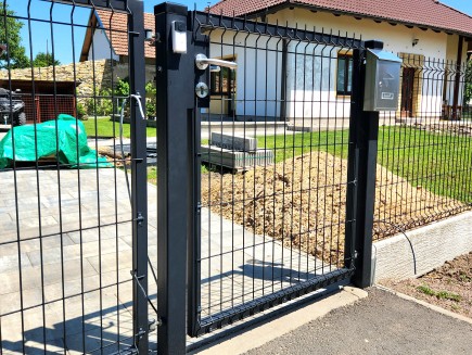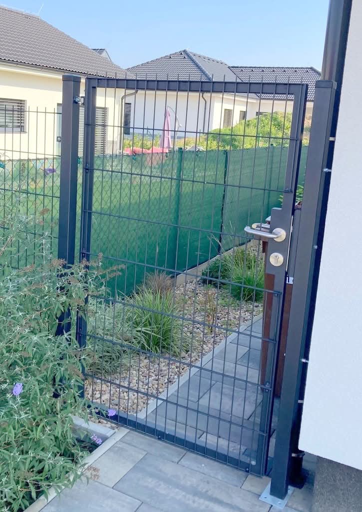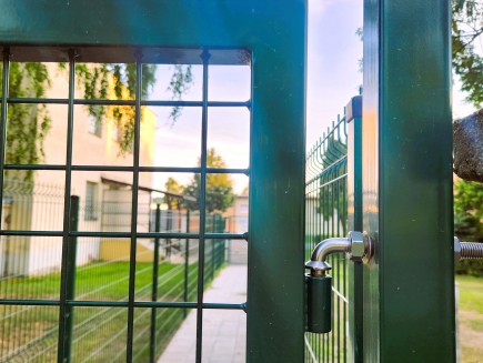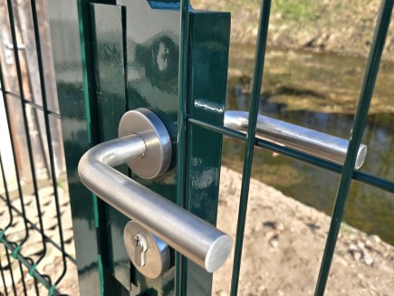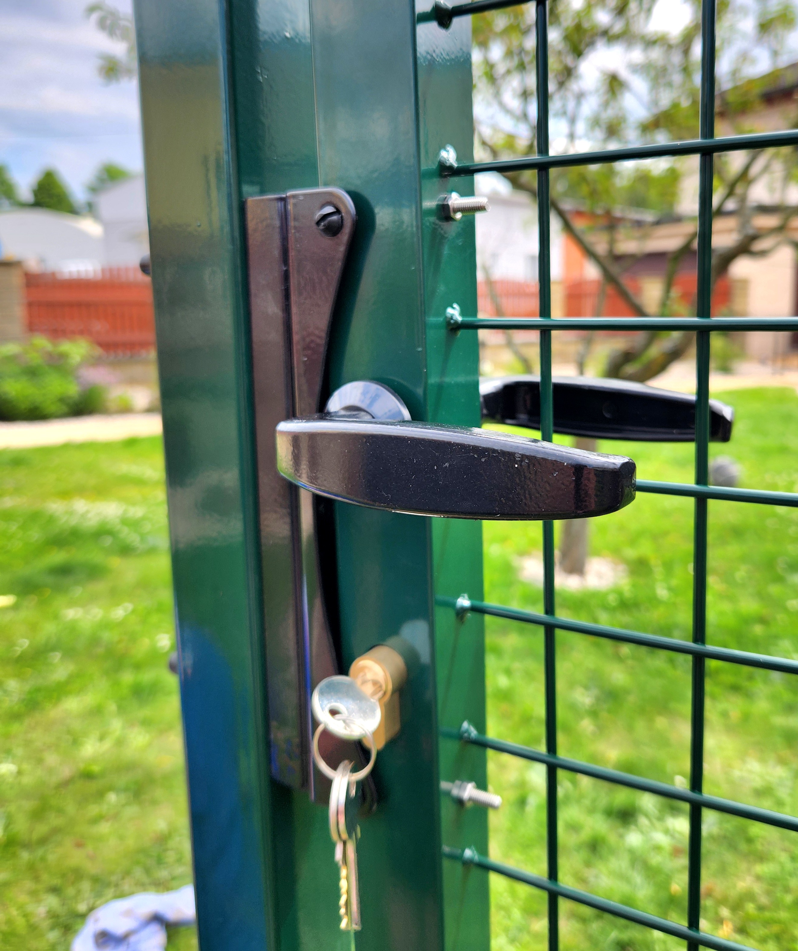 Modern steel gate with square posts . The height of the wing is 120cm and the width of the wing is 100cm green (you can choose a different color or 3D and 2D panel strings using the "modification" button) , plastic-coated, with handle closure. The width of the entire gate incl. posts is approx. 117cm. This gate is particularly suitable for building fences in combination with LARIO , LARIOEco , 2D , Executive plus , Executive Plus anthracite , Top 100 panels. Thanks to its robustness and modern appearance, it is also suitable for urban furniture, playgrounds, parks, etc.