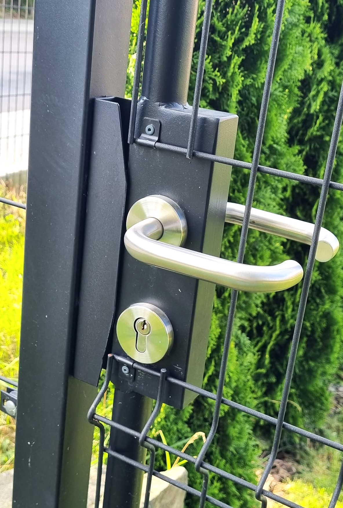 * Gate accessories : upper and lower adjustable stronger PLUS hinge, with which you can easily adjust the exact position of the gate leaf, all fittings, gate stop, fasteners and stainless steel handle . The gate can be opened to the street and to the property (set with the gate sheet metal stop. When placing an order, we need to state whether you want the stainless steel handle on the right or left side when viewed from the street and in the order notes whether you want the panel pins to extend beyond the frame or not. You can purchase a cylinder insert for the gate.