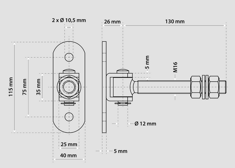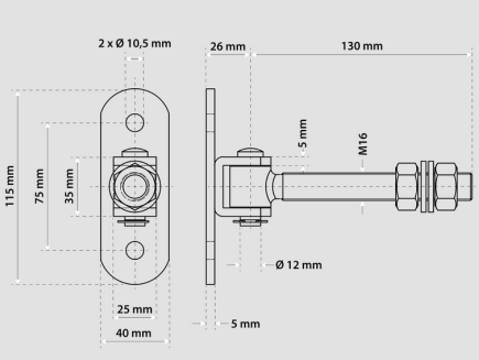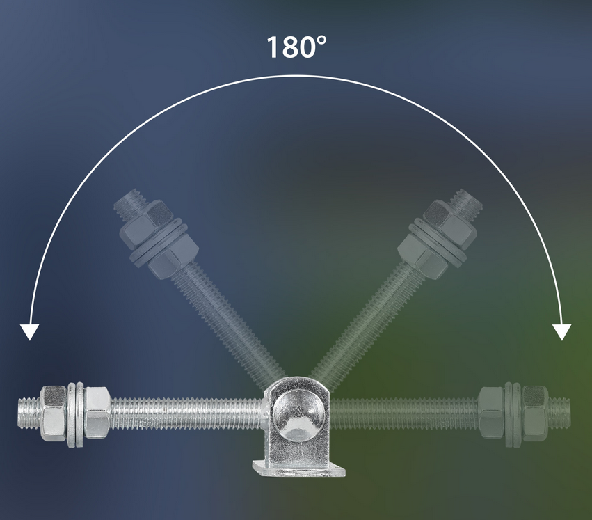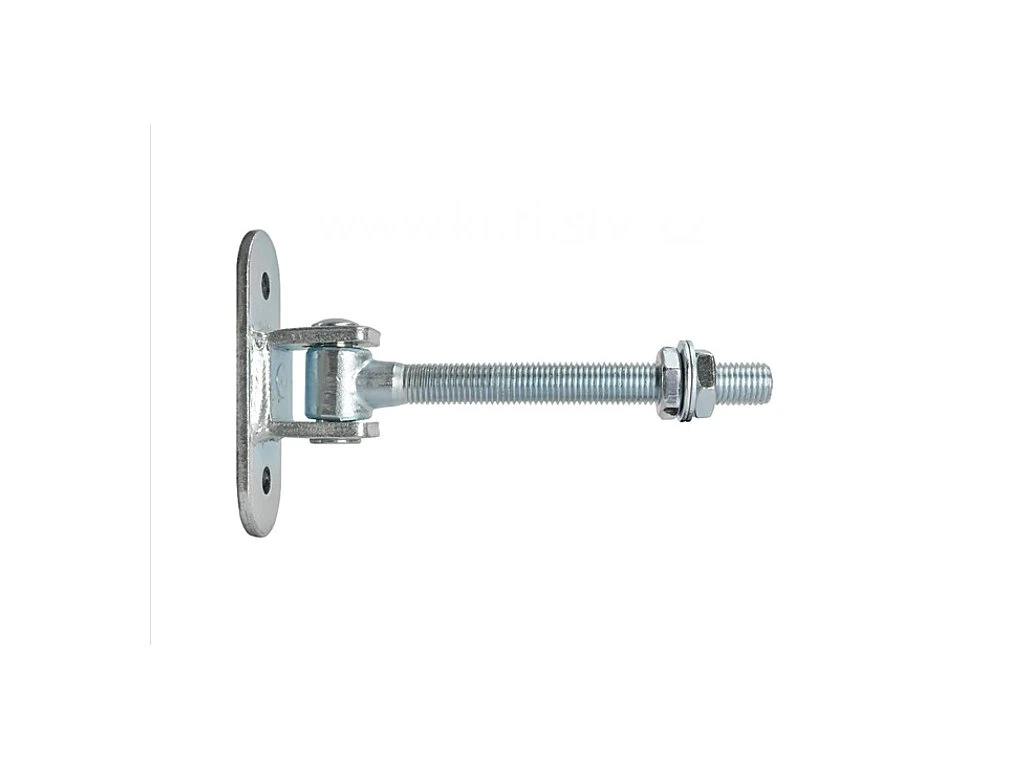 Adjustable hinge for opening wings up to 180 degrees with M16 thread designed for mounting swing gates and gates. The hinge allows the gate/gate wing to open 180 degrees ("up to the fence") due to the offset of the hinge body.