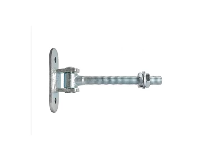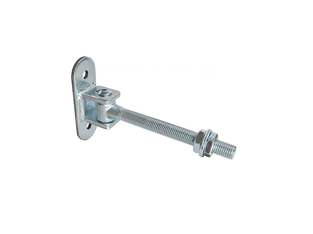 It has a plate with two holes for screwing or welding onto the gate post and a threaded part for adjusting the hinge, which allows for optimal adjustment of the structure after installation.