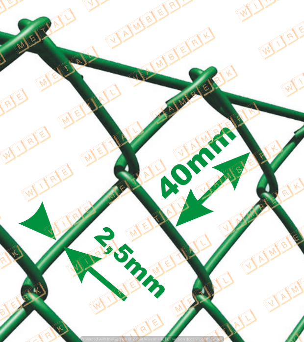 Mesh height without braided tension wire 180 cm, mesh 4x4 cm, wire incl. plastic coating diameter 2.5 mm, the surface of the mesh for the courts is a hot-dip galvanized steel core dia. 1.7 mm coated with extruded plastic. The given surface treatment guarantees a long service life and durability.