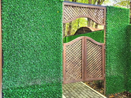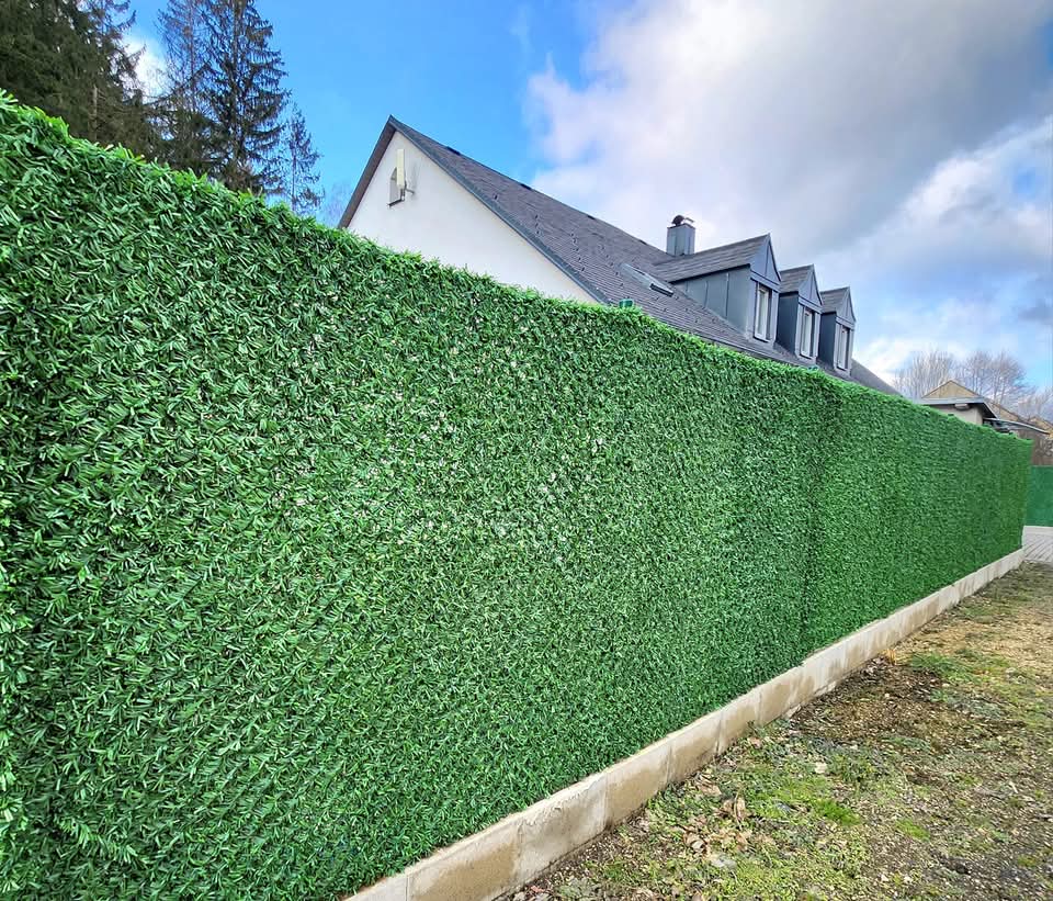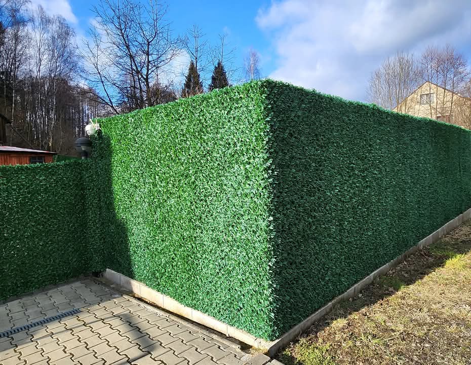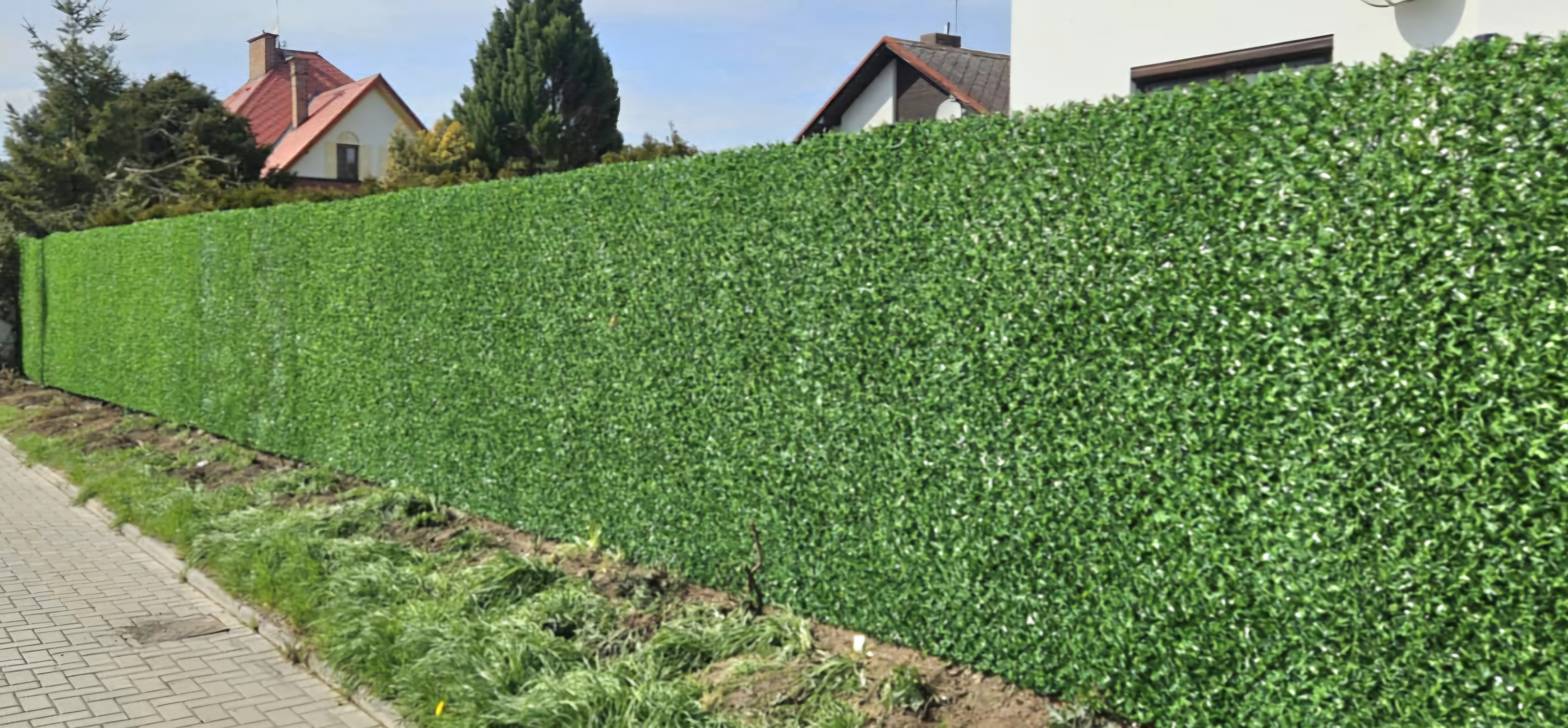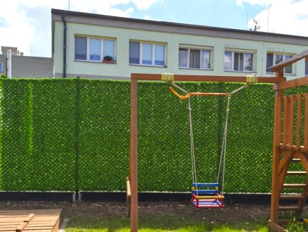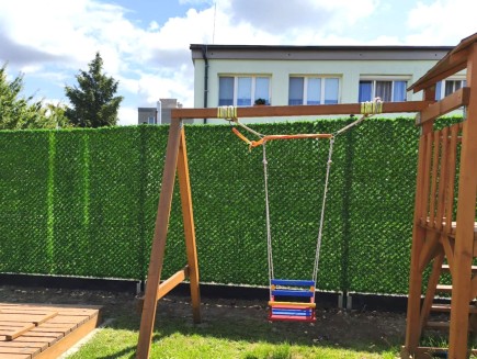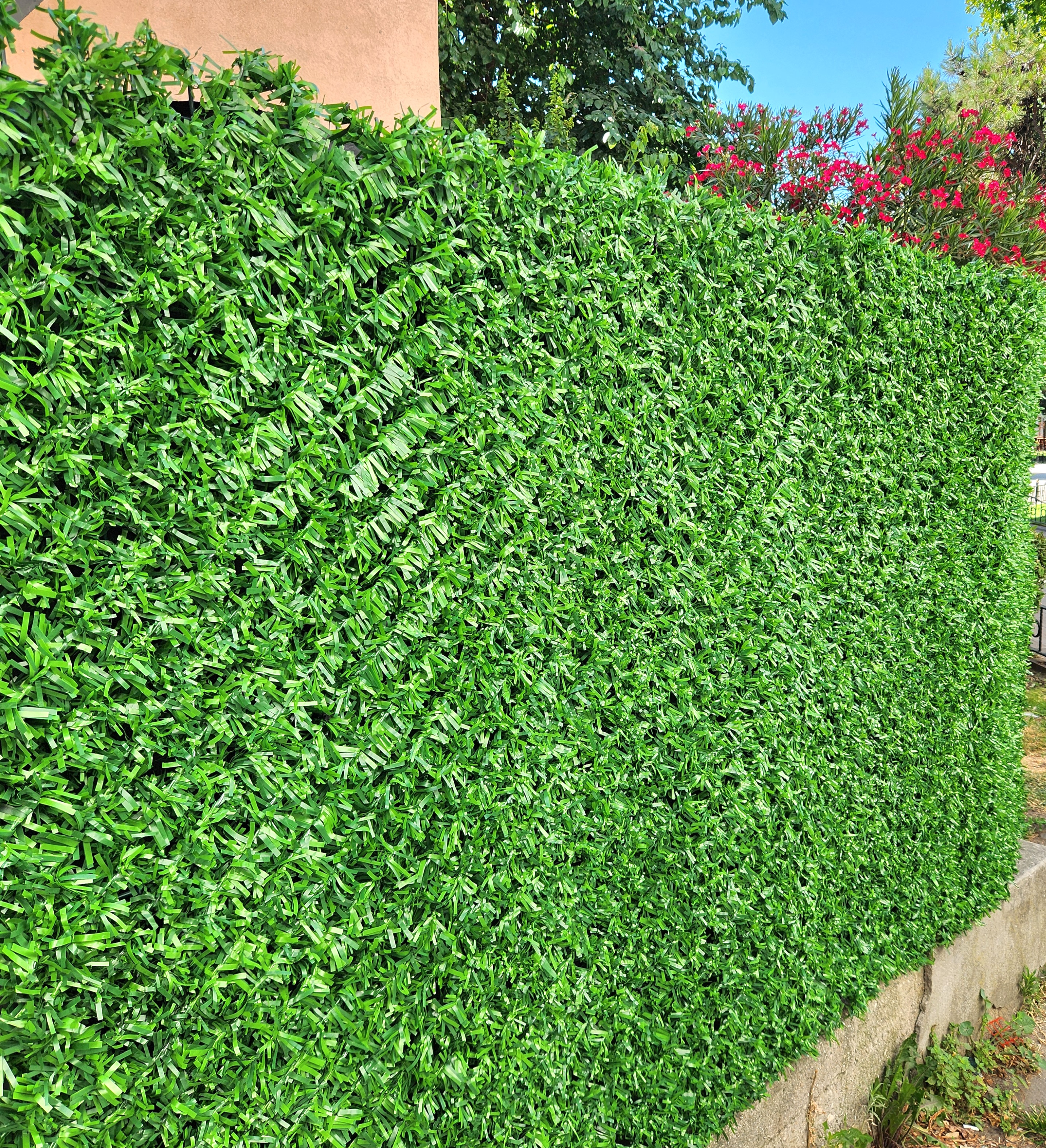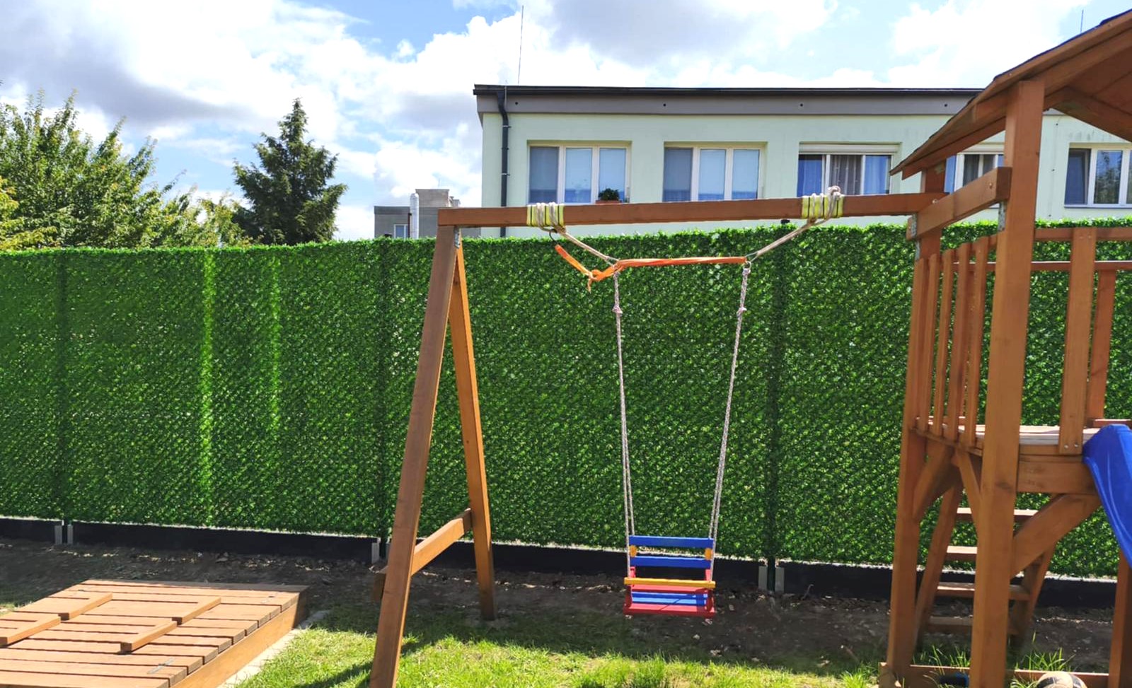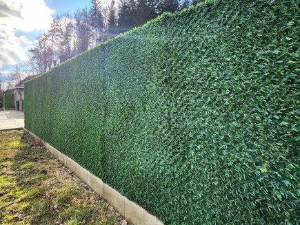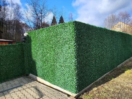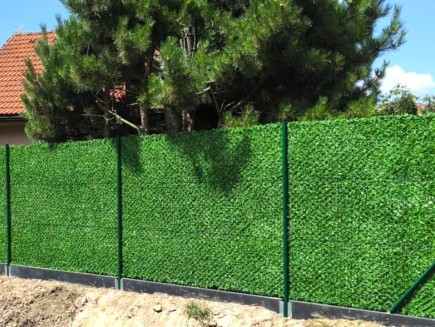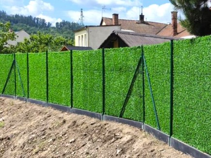 Plastic-coated green mesh 180cm high made of galvanized wire with fused stems of artificial grass imitates living natural and brings fresh greenery to your garden and enlivens the walls of your fence. 100% opaque fence and at the same time with the possibility of wind blowing through during gusts of wind, etc. It prevents leaves and dust from flying into your property, reduces noise, smog, dust. The wire is 1.6mm/3.2mm in diameter, the mesh size is 44x44mm