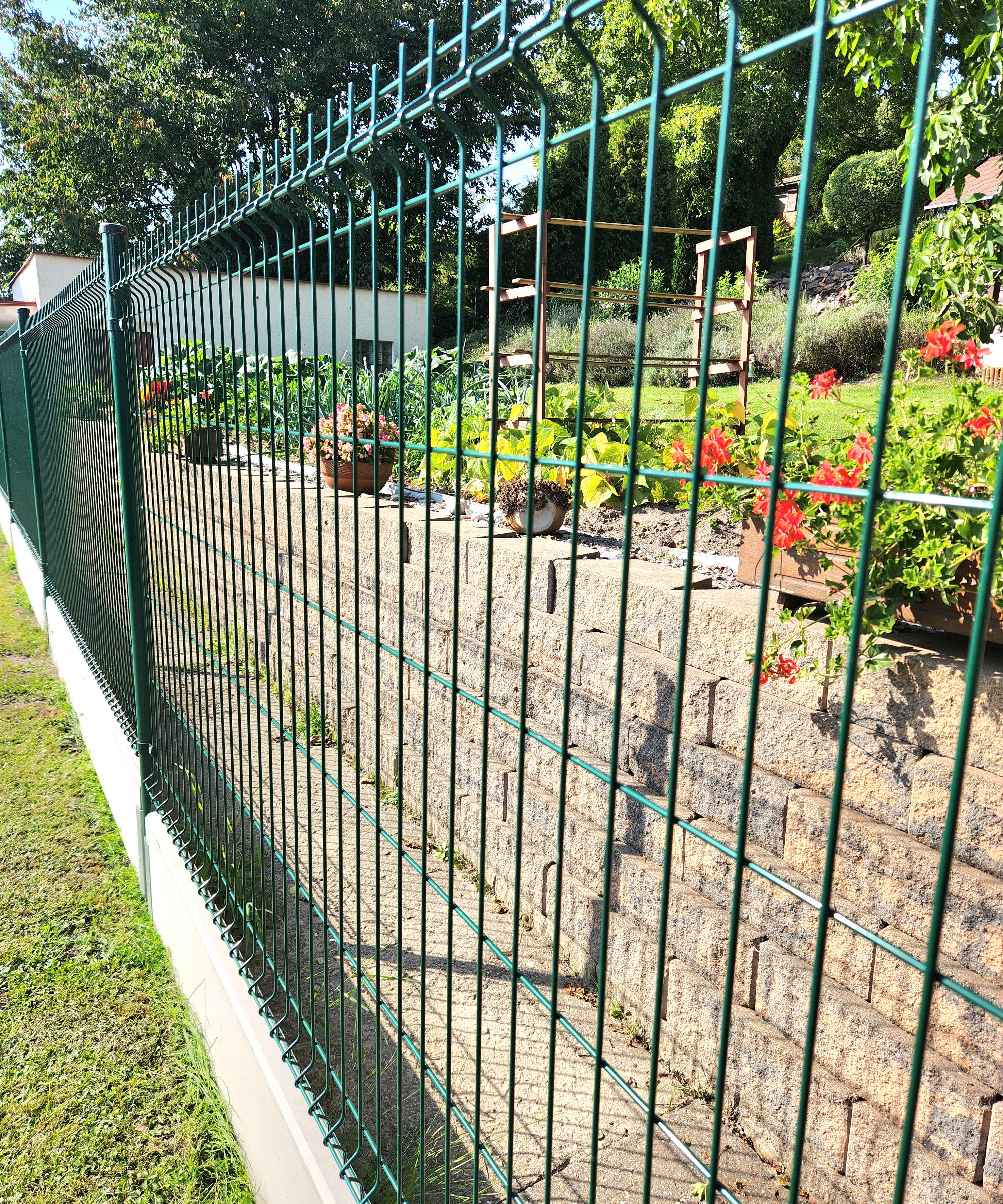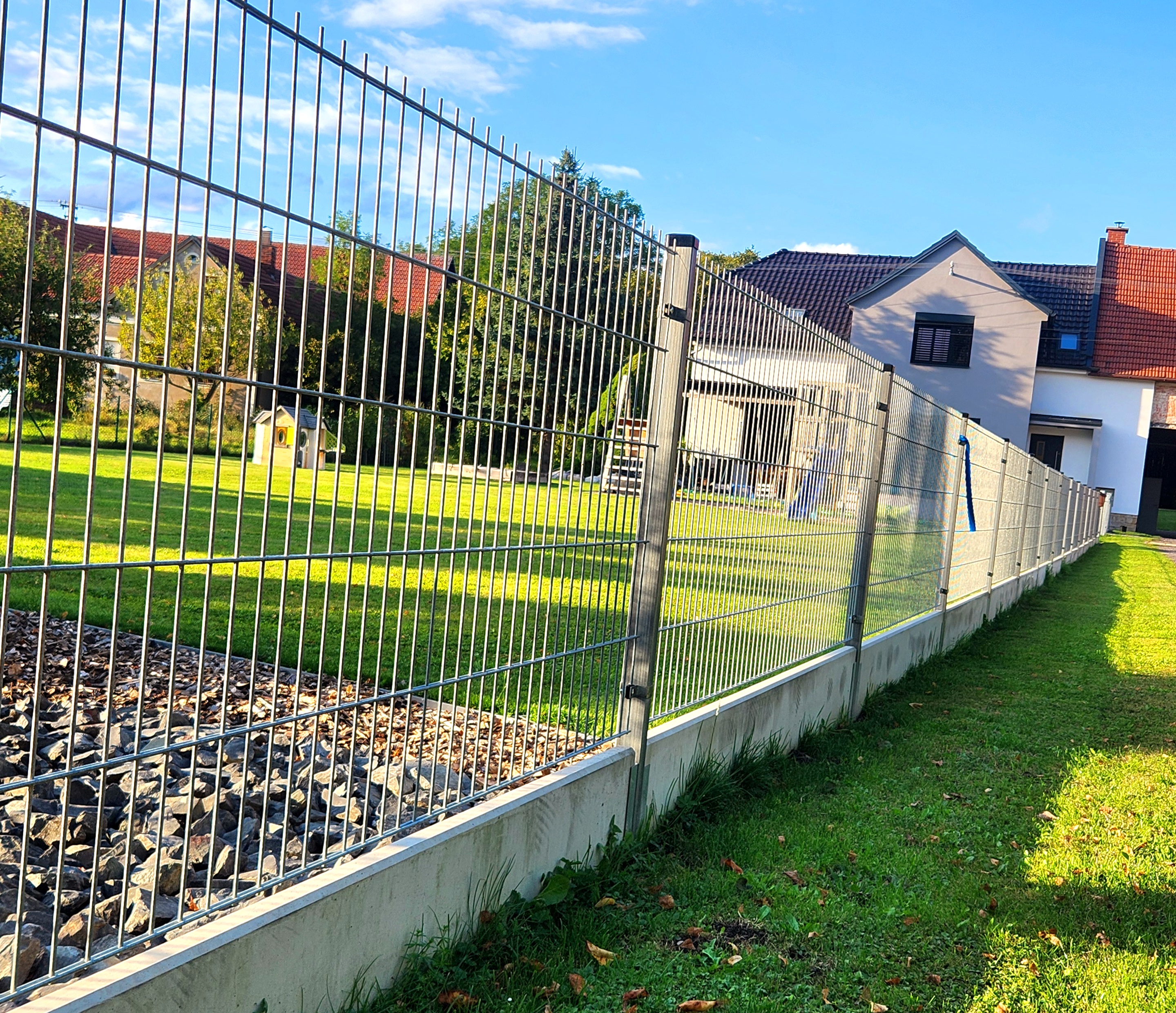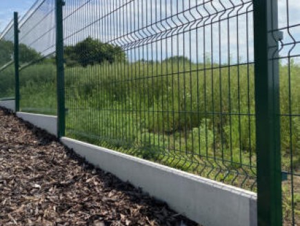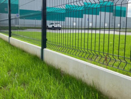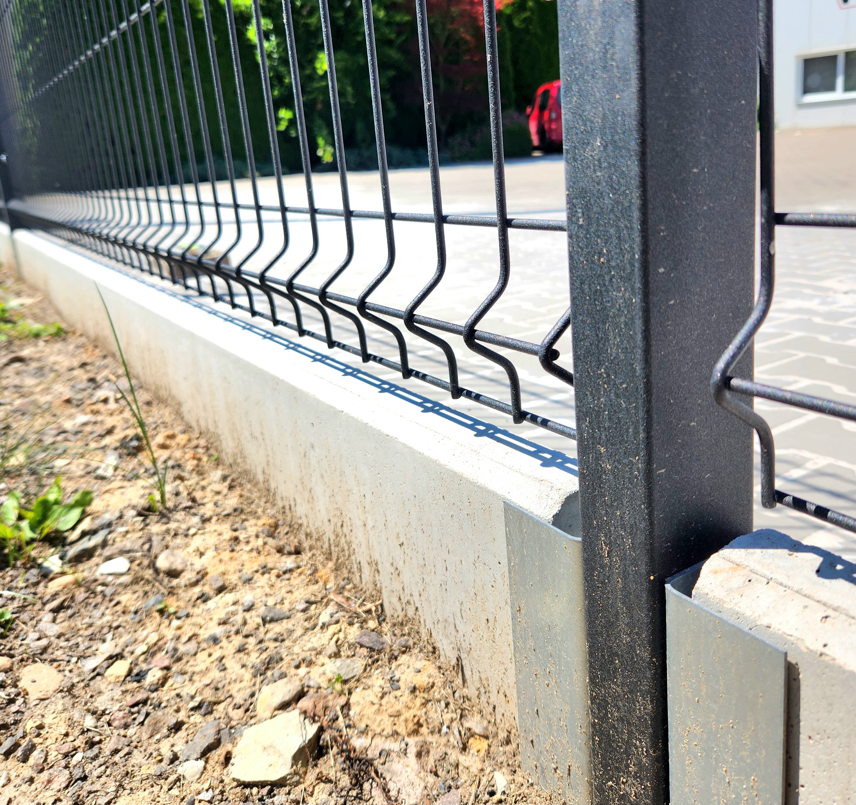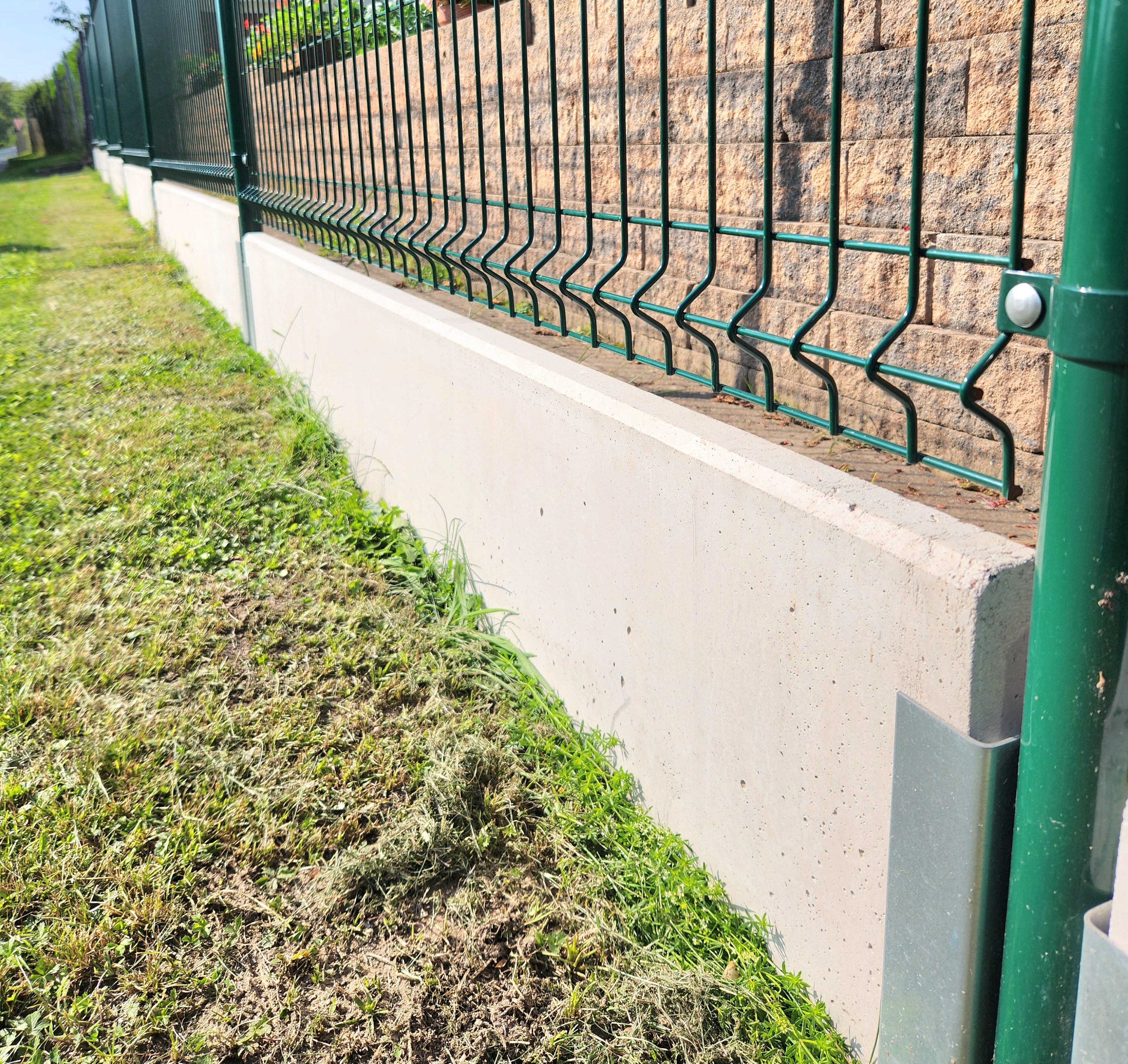 A concrete edging board is the only functional option (unlike plastic board substitutes, etc.) to prevent grass from growing through the fence, to strengthen and thicken the entire fence, and to prevent animals from digging under it. Using a concrete board will increase the utility value of the entire fence and ensure easy mowing and excellent maintenance of the greenery around the fence.