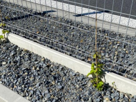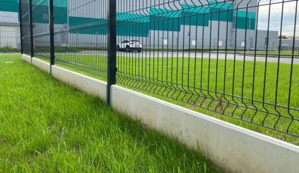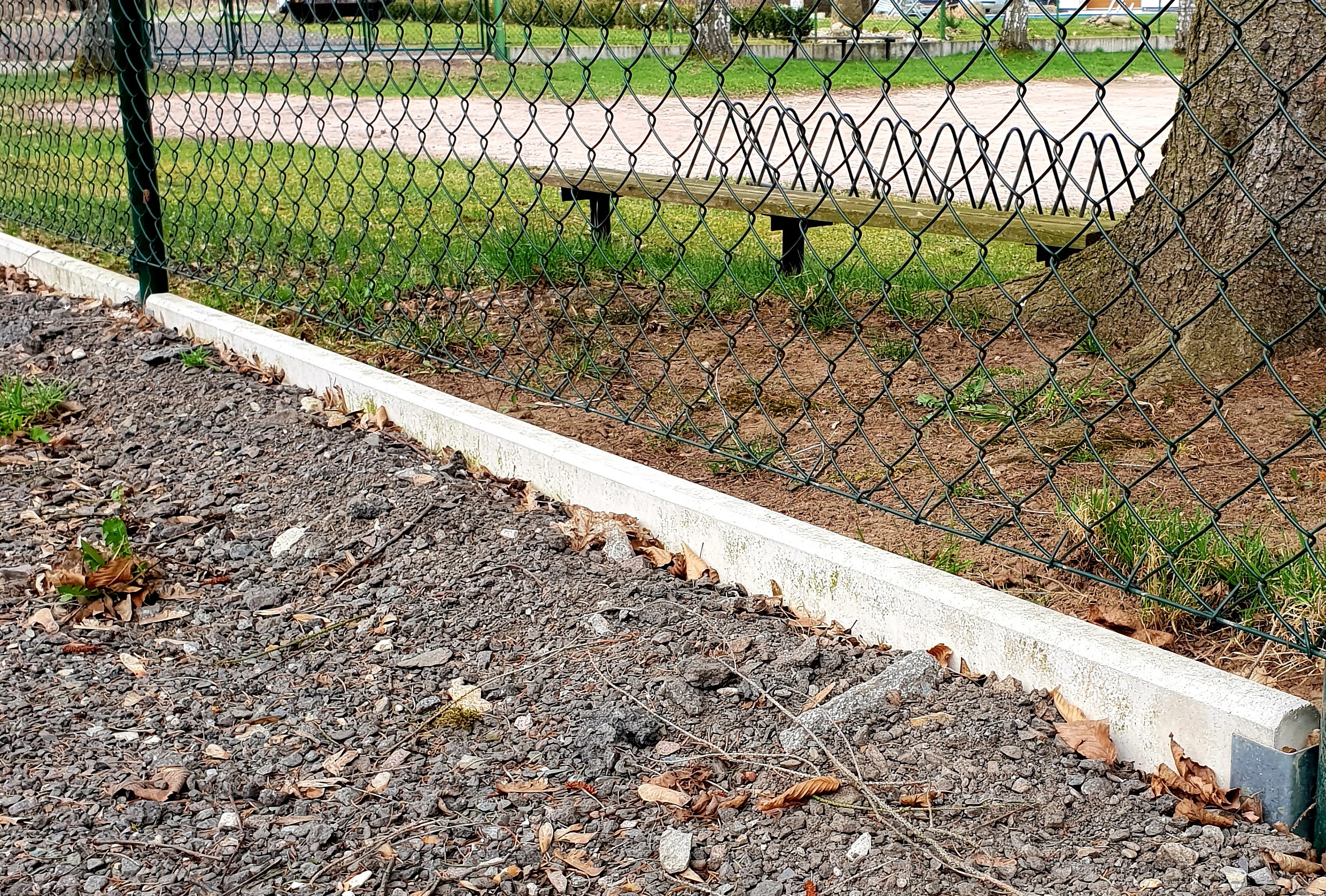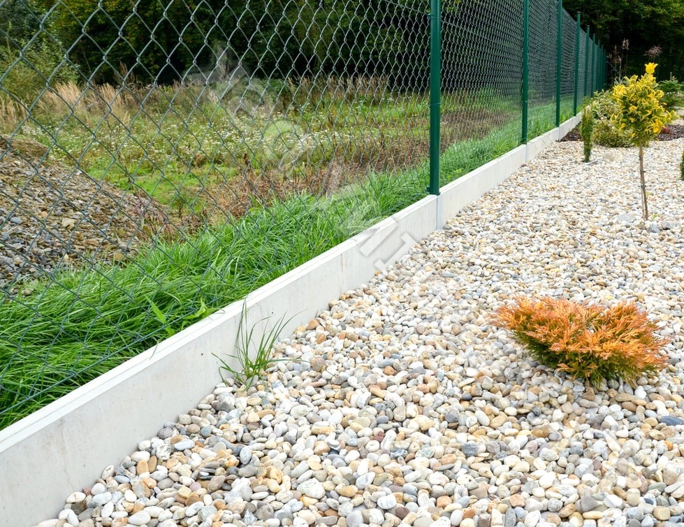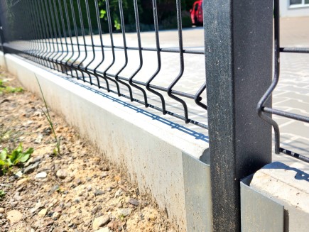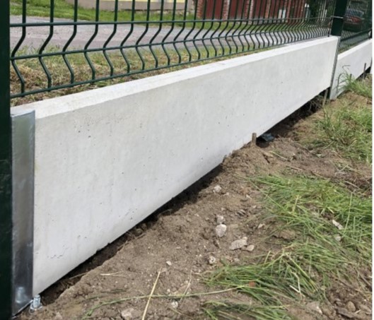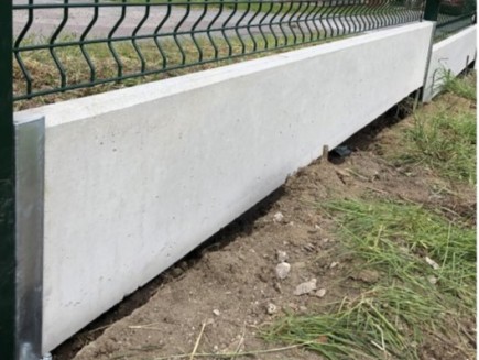 A concrete edging board is the only functional option (unlike plastic board substitutes, etc.) to prevent grass from growing through the fence, to strengthen and thicken the entire fence, and to prevent animals from digging under it. Using a concrete board will increase the utility value of the entire fence and ensure easy mowing and excellent maintenance of the greenery around the fence.