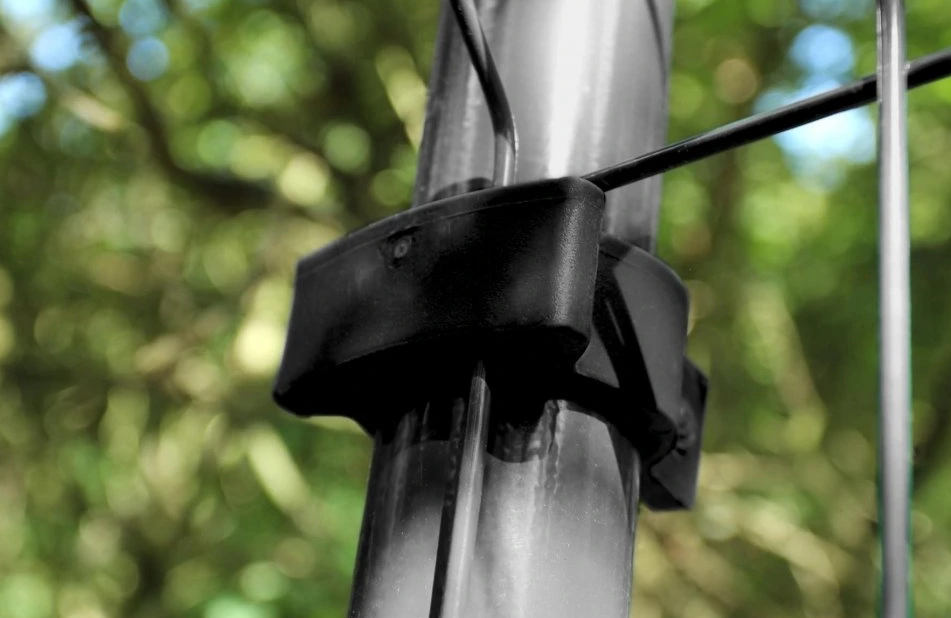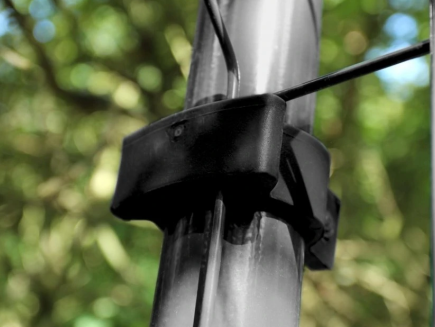 Plastovou objímkou z kvalitního pevného zeleného plastu se obejme sloupek a do drážek se vloží konec a začátek dalšího panelu. Ze zadní strany se poté stáhne objímka šroubem. Objímka umožňuje distanční vůli uložení panelů v rozmezí 5 cm.