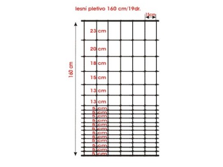 Výška 160 cm, 19 řad vodorovných drátů (od 5 cm rozteče), rozteč svislých drátů je 15 cm. Pletivo vyrobeno ze zinkovaného drátu 1,8 mm, vrchní a spodní vodorovný drát 2,5 mm. Velmi zahuštěno do cca 75 cm. Odlehčené lesní pletivo za skvělou cenu na stavbu oplocenek, sadů, rozsáhlých zahrad, vyznačující se zvýšeným počtem vodorovných drátů ve spodní části pletiva.